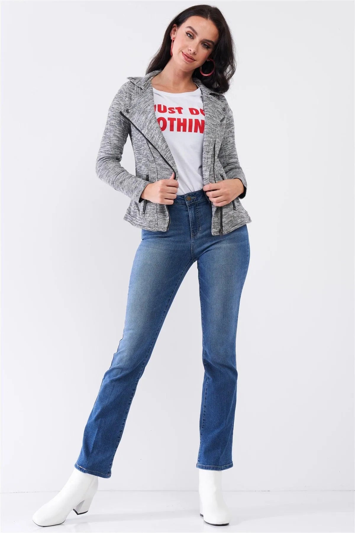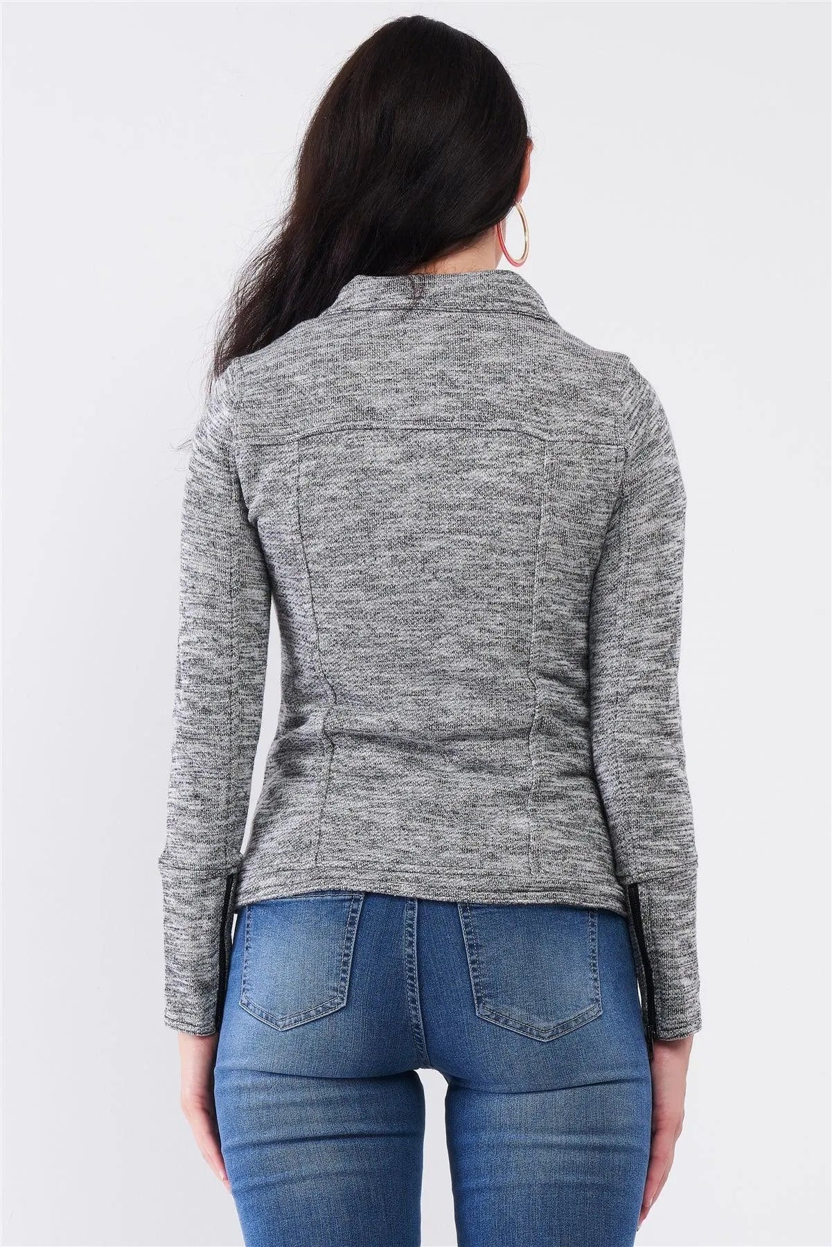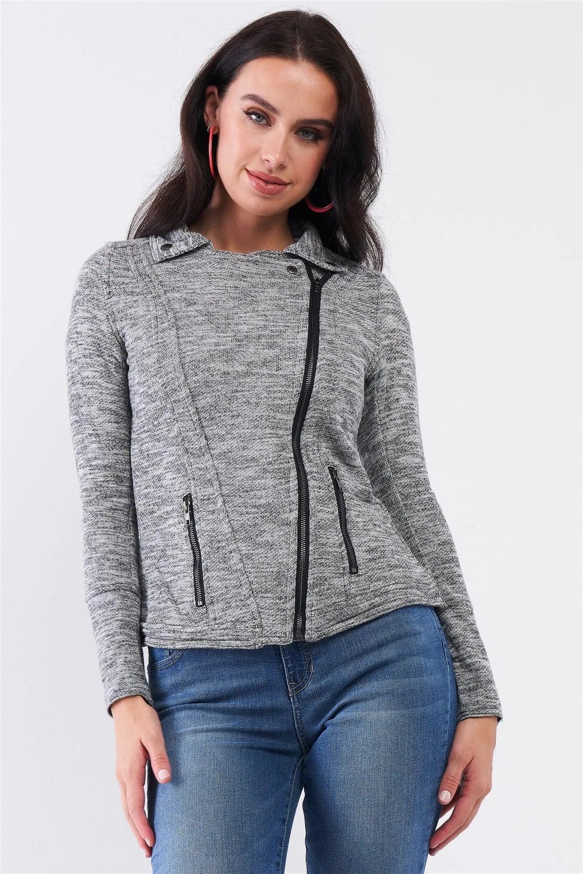 Heather Grey Knit Asymmetrical Zipper Front Long Sleeve Fitted Moto Jacket /2-2-2-1