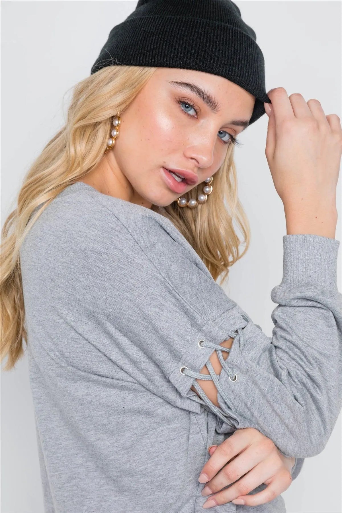 Sweater features: long sleeves with cross string detailing, dropped shoulders, round ribbed neck and cuffs, unlinedModel is 5'8 wearing a size Small ( Waist: 24", Bust: 32B, Hips: 34")Item measurements: Length: 24.5", Bust: 46", Sleeves: 26"True to size