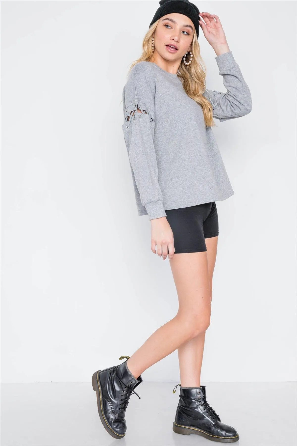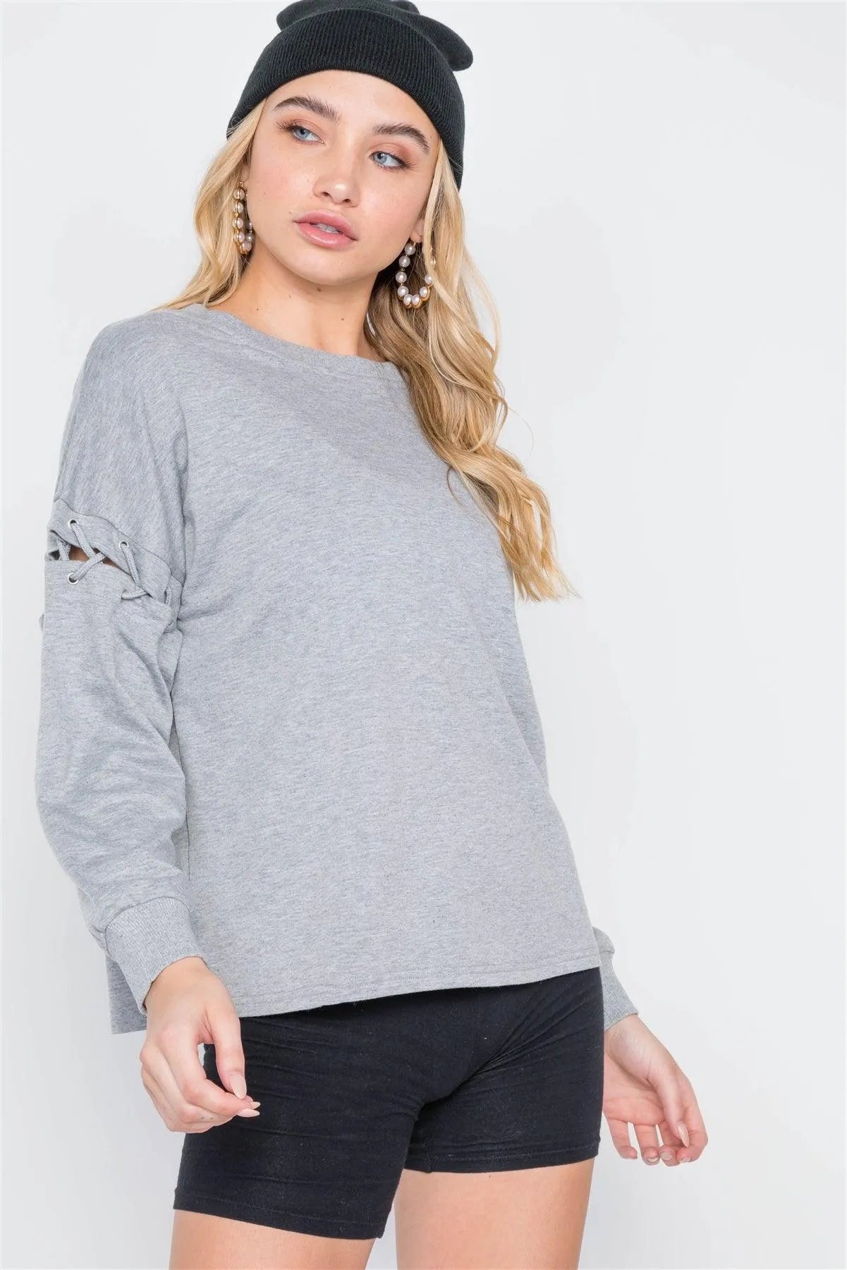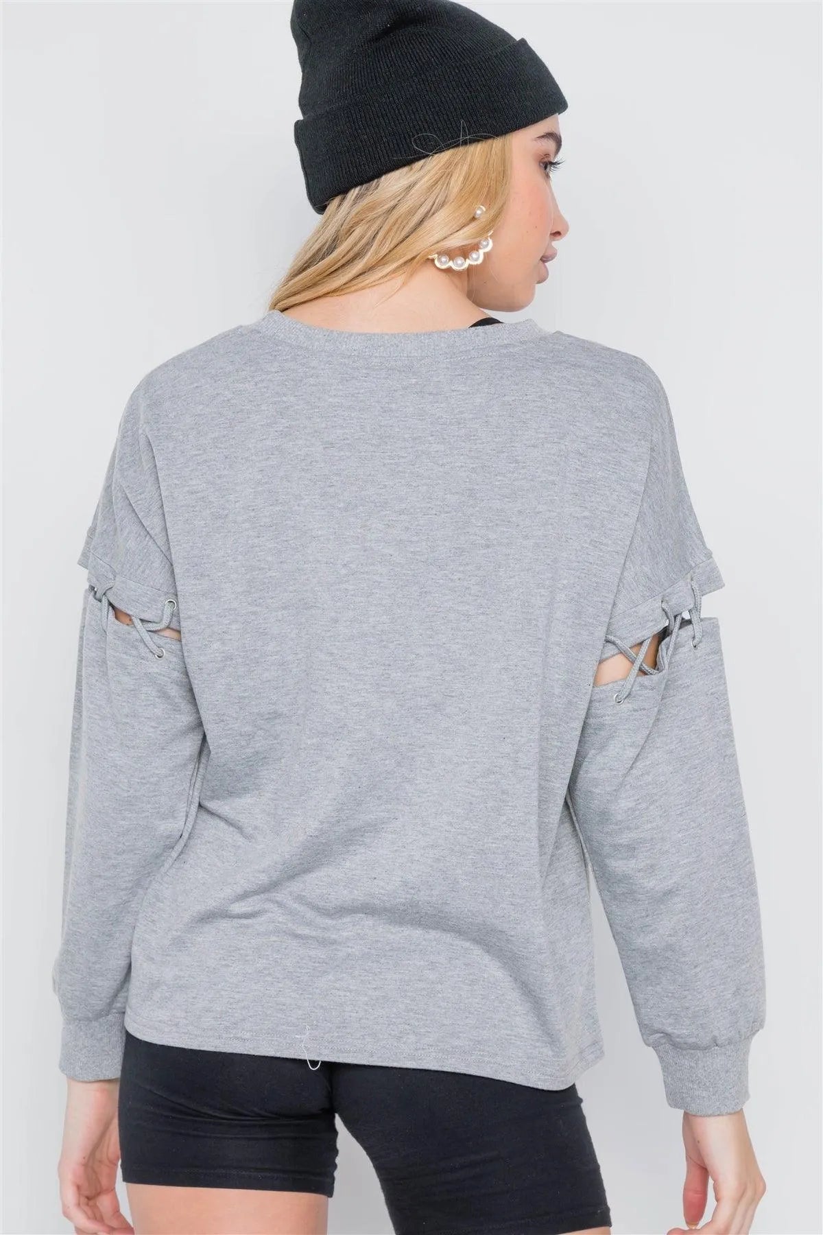 Heather Grey Laced Sleeves Solid Sweater /3-1-2