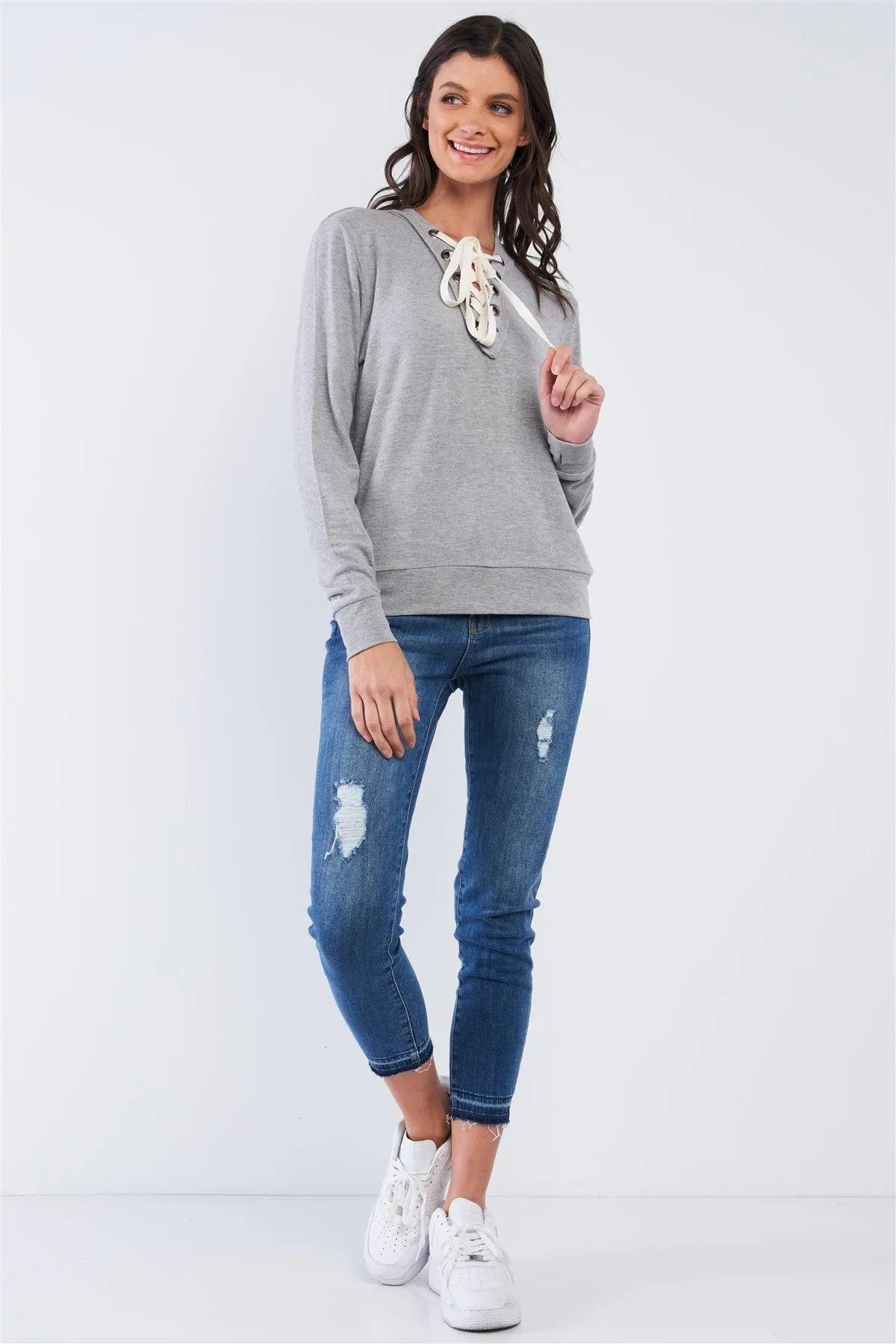 Heather Grey Casual Long Sleeve Lace Up Front Detail Top /2-2