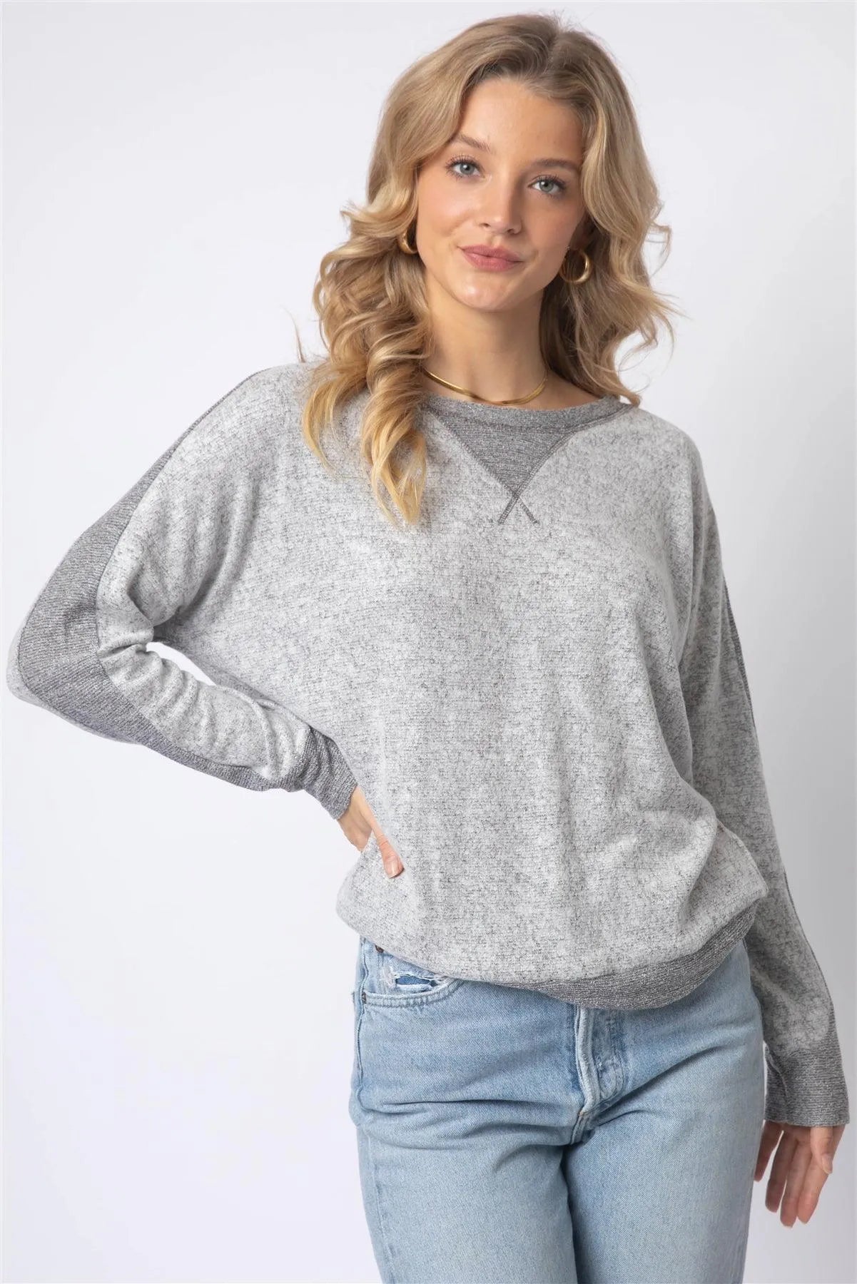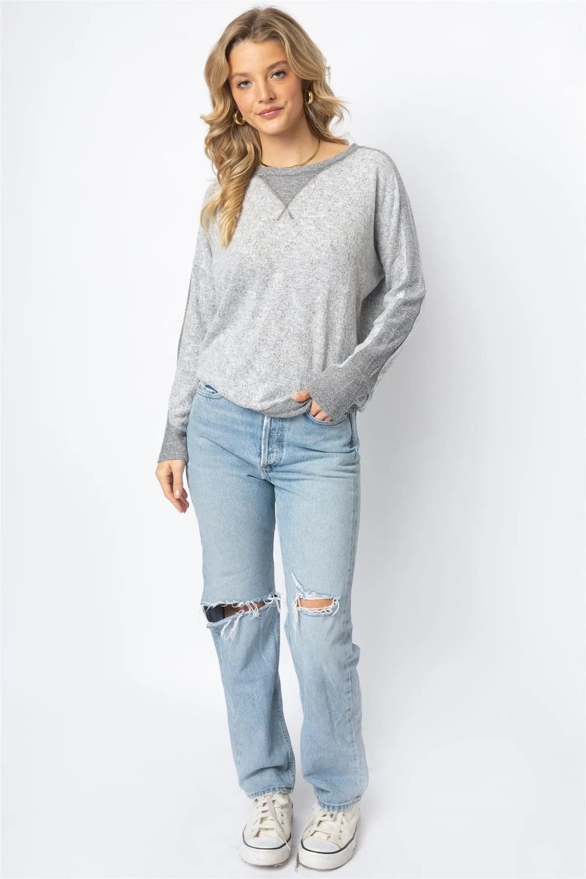🖤 Item Features: Heather grey, textured material, long sleeves, round neckline, dropped shoulders, trim details, cuffed hem, relaxed fit, not see through, stretchy, unlined, casual, cute, stylish, trendy, comfy, everyday look, must-have