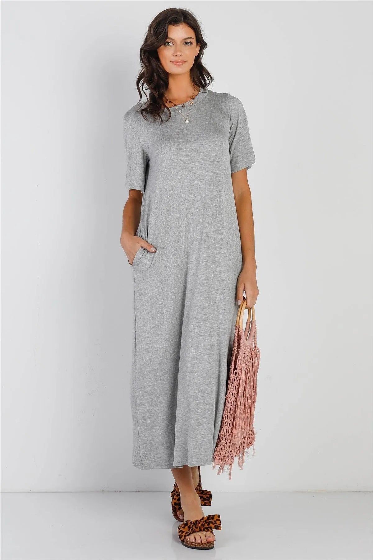 🖤 Item Features: Heather grey, solid color, crew neckline, short sleeves, two side pockets, midi length, relaxed fit, unlined, stretchy, non-sheer, casual, cute, trendy, stylish, everyday look