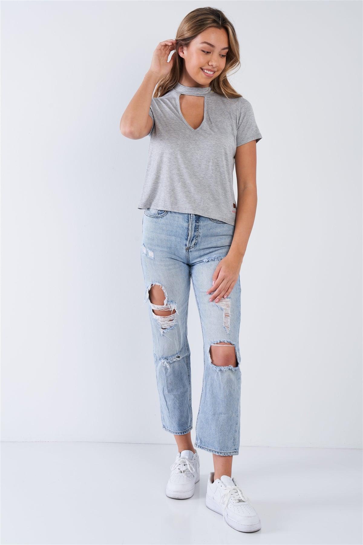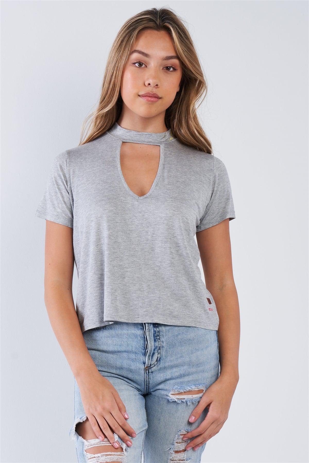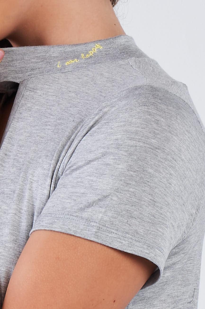 Heather Grey Short Sleeve Open Key Hole "I AM HAPPY" Top