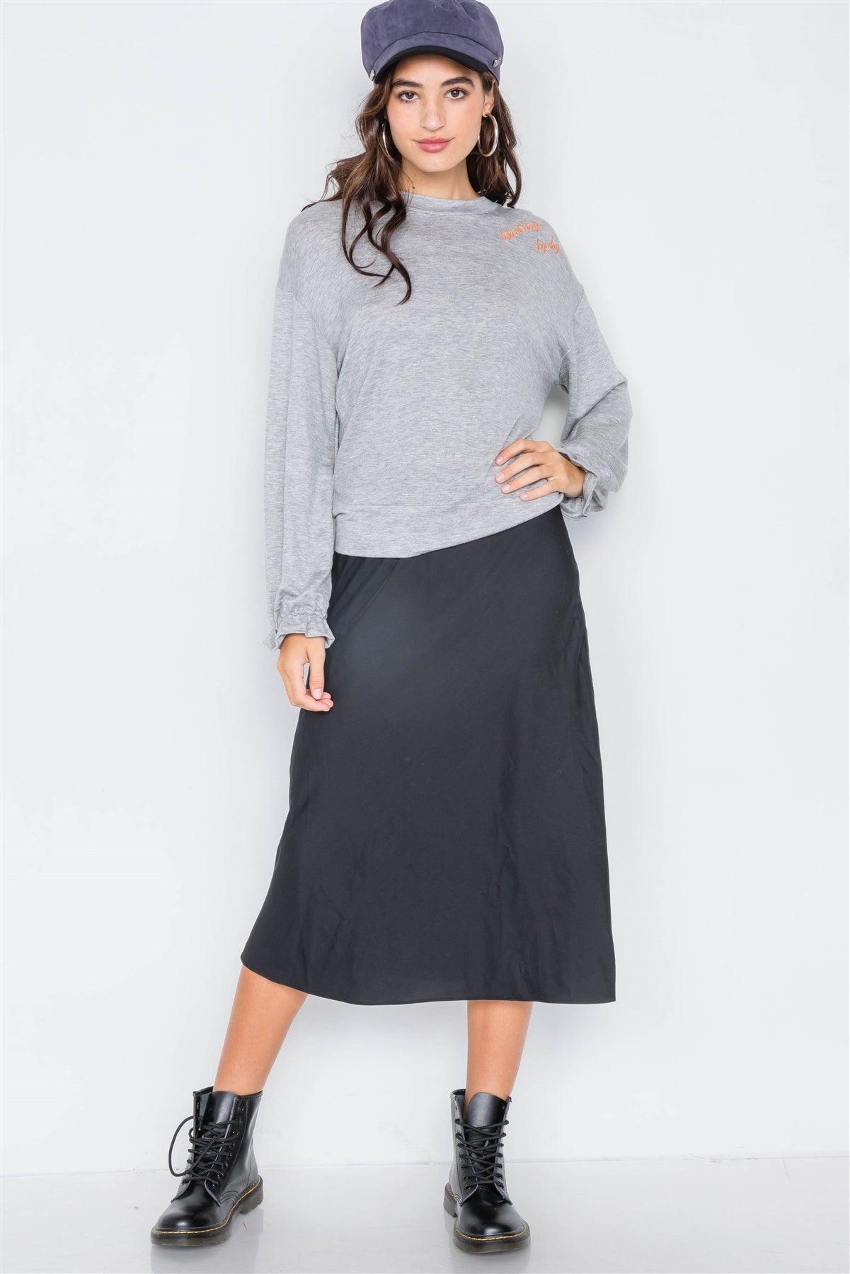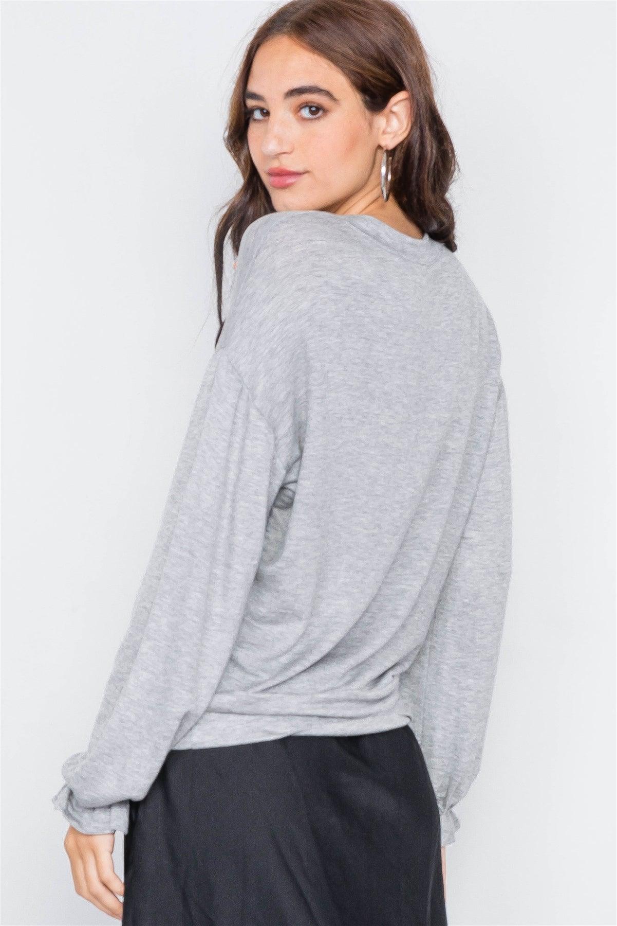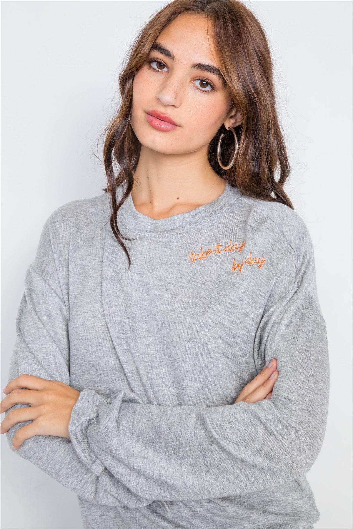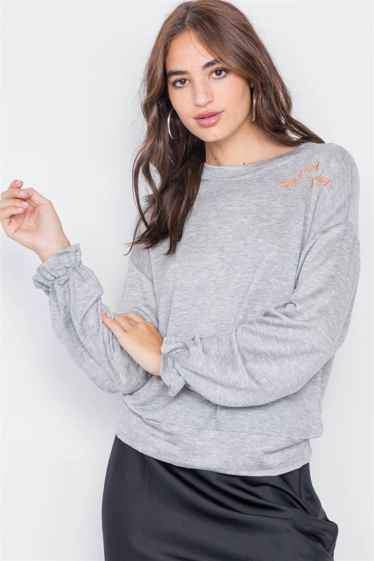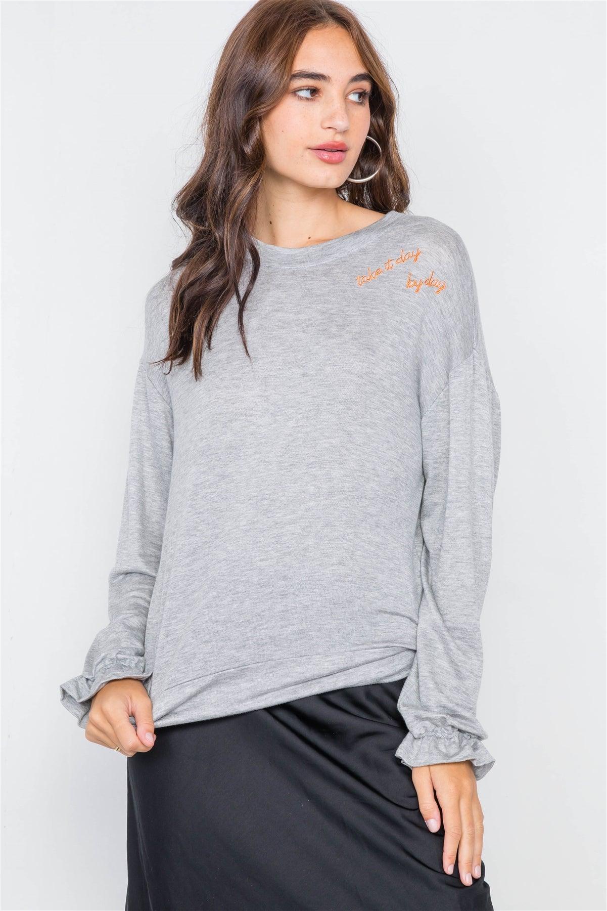 Heather Grey "TAKE IT DAY BY DAY" Graphic Cozy Flounce Cuff Sweater /2-2-2