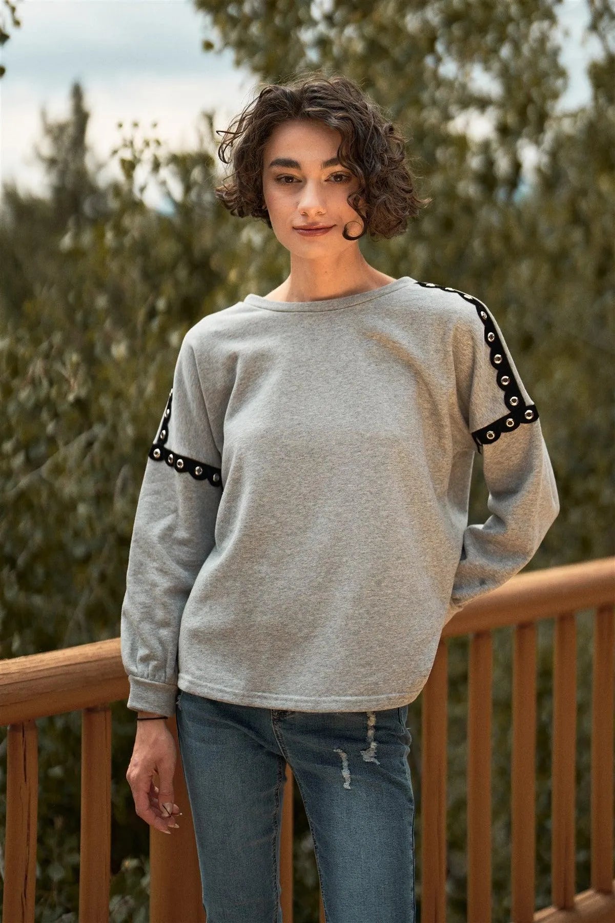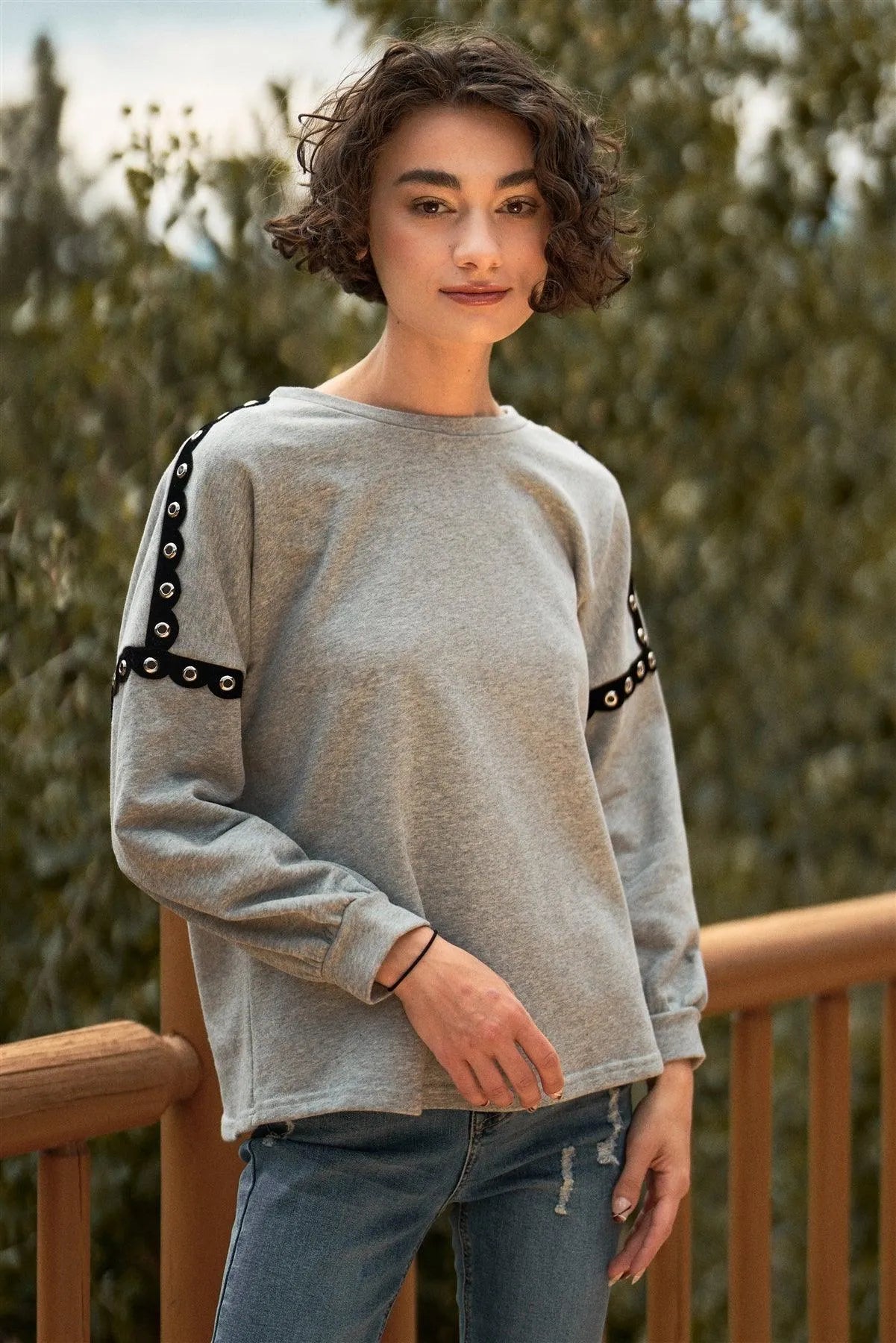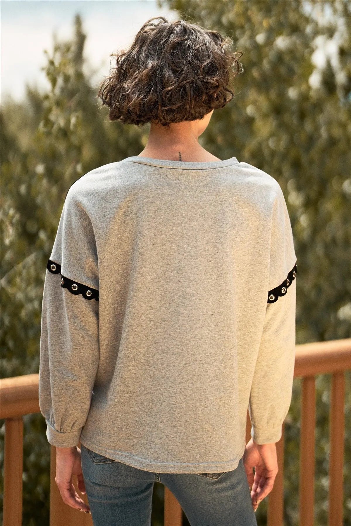 Heather Grey Round Neck Velvet & Grommet Trim Balloon Sleeve Relaxed Top /1-2-2-1