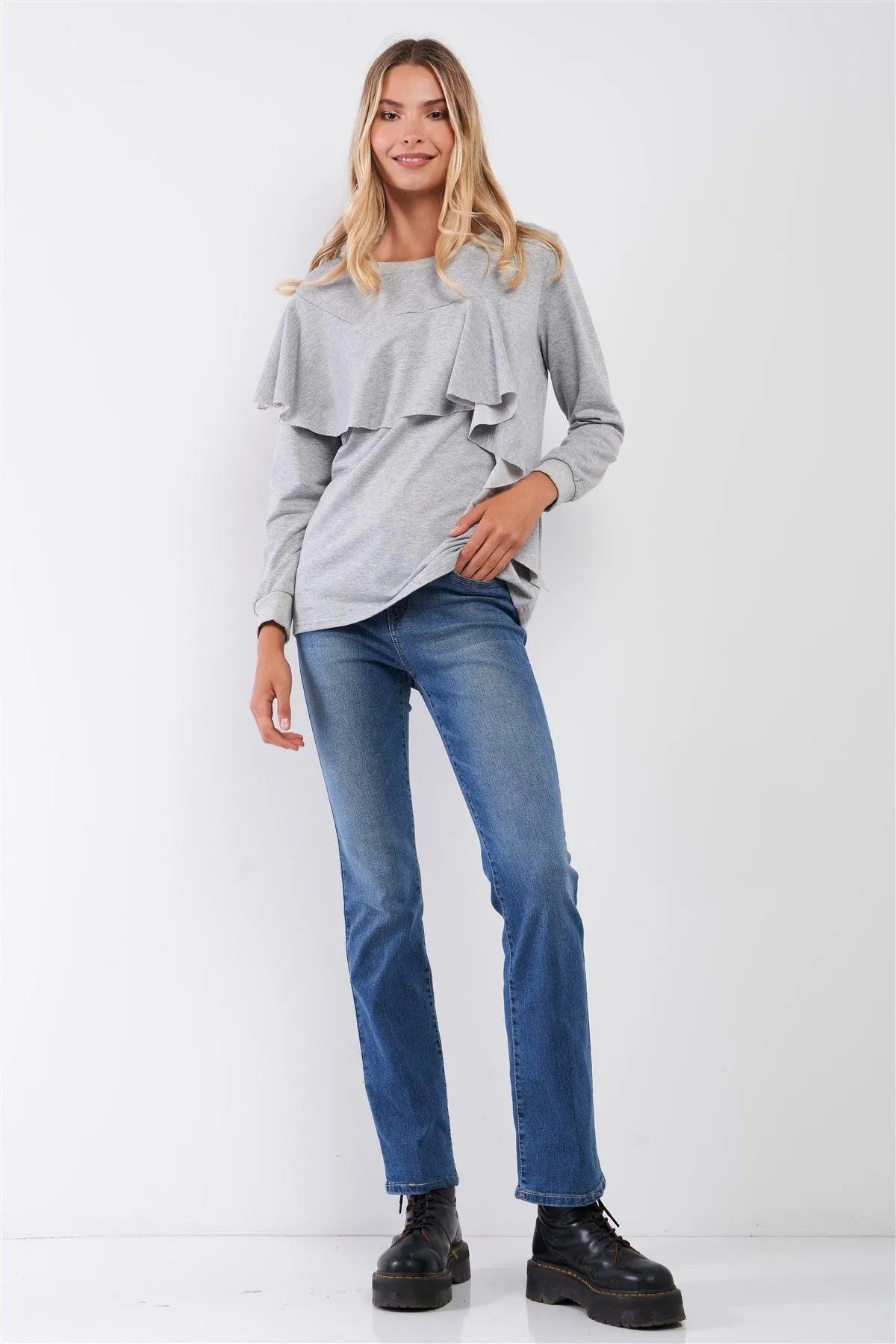 Heather-Gray Ruffled Crew Neck Long Sleeve Sweatshirt /2-2