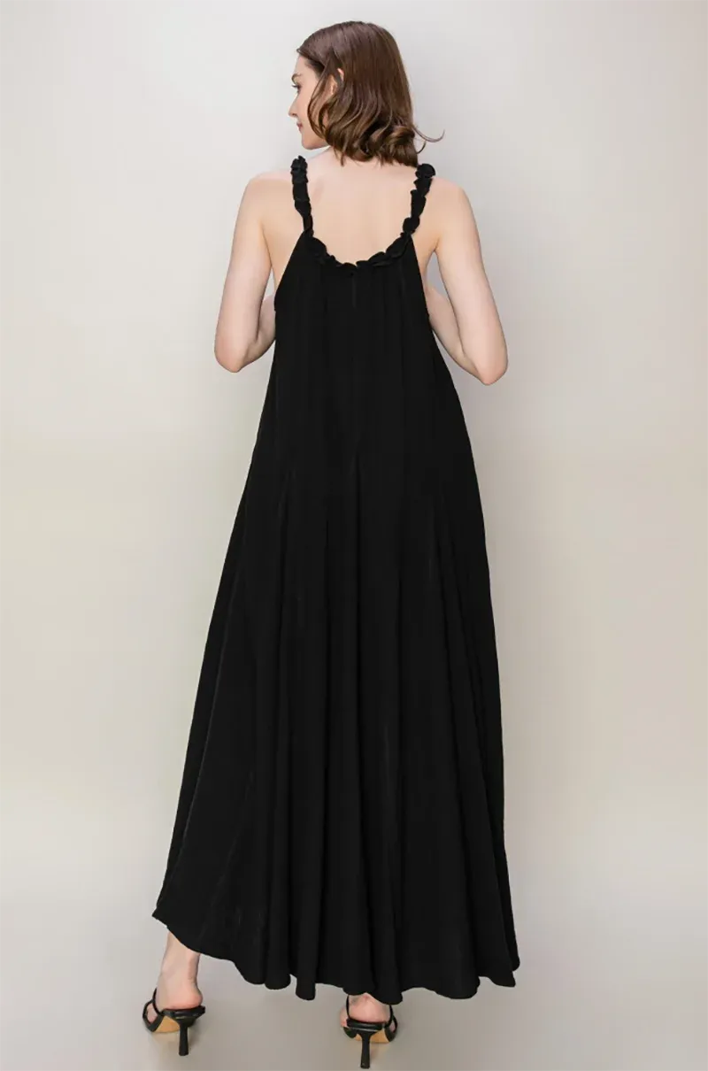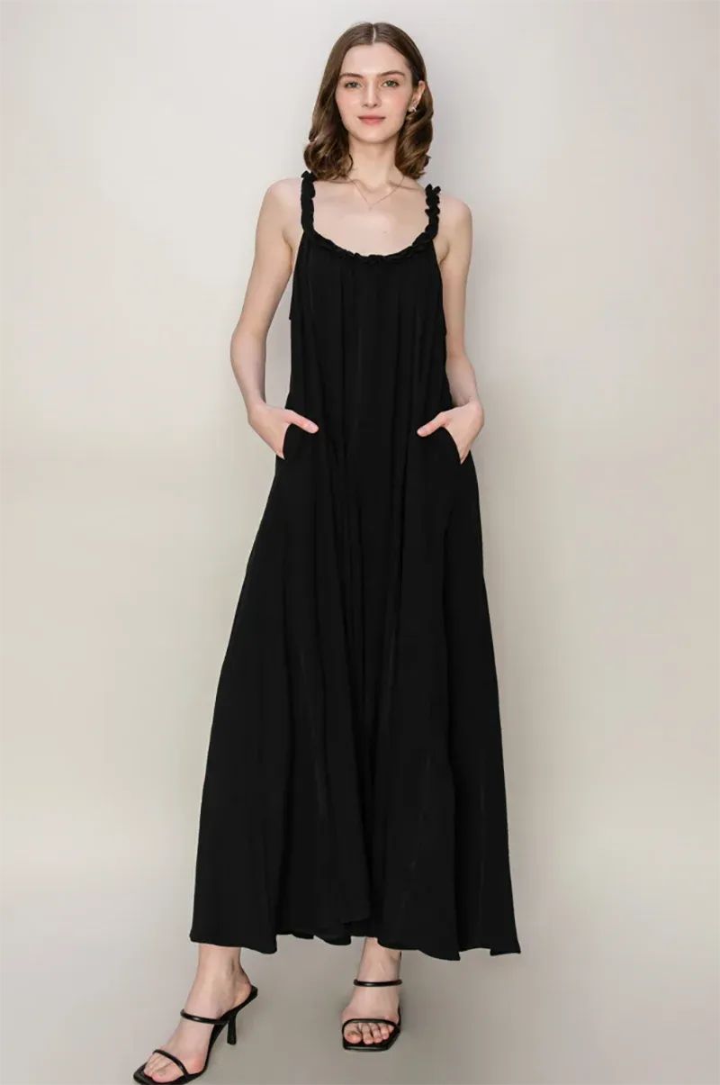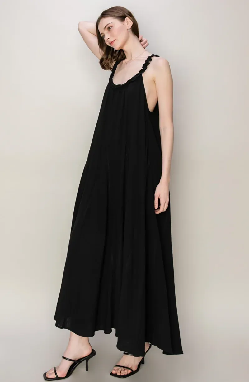 🖤 Features: 100% cotton, lightweight, breathable, ruffle straps, flowy silhouette, ankle length, functional side pockets, relaxed fit, open back design, easy care fabric