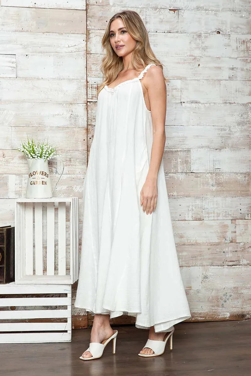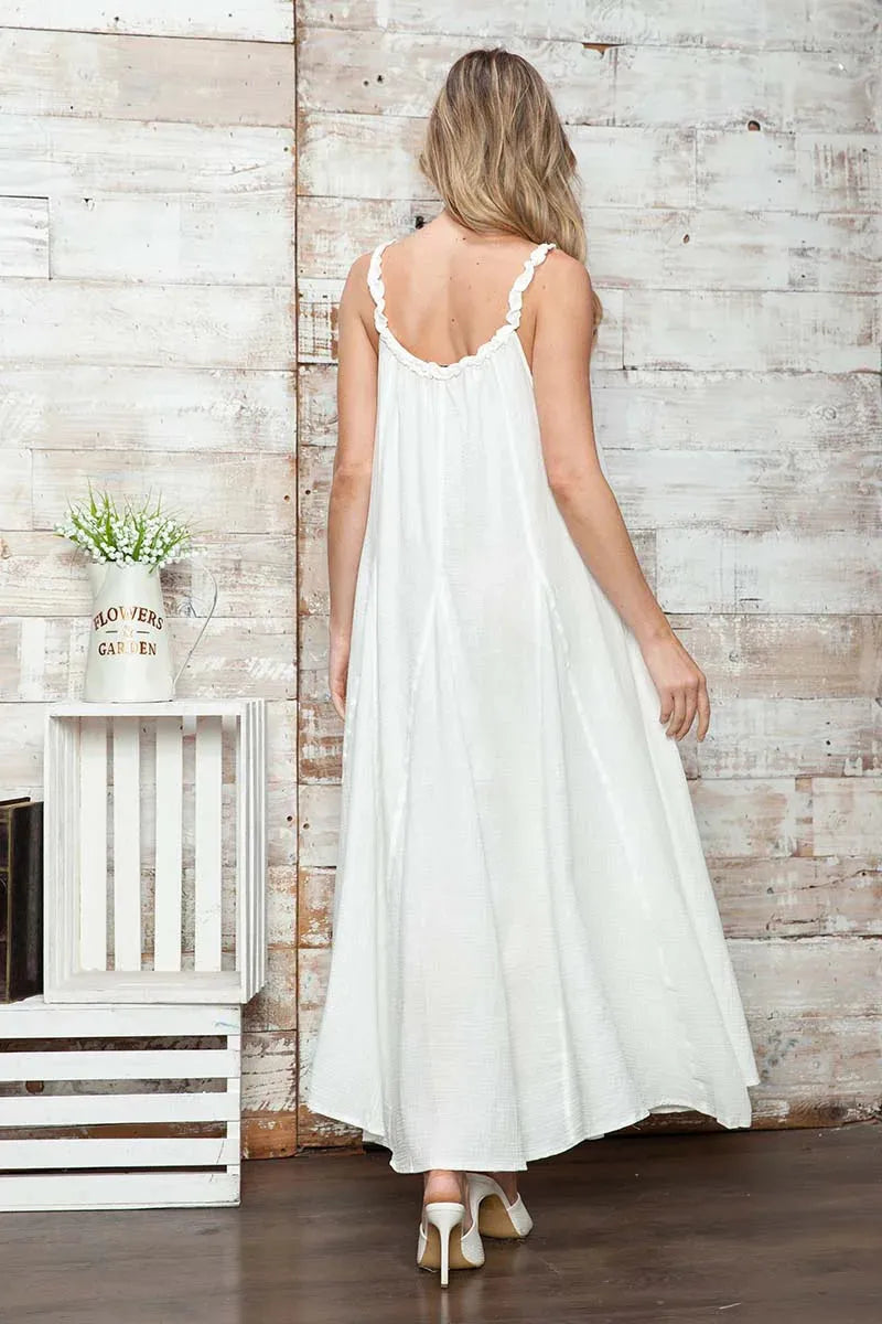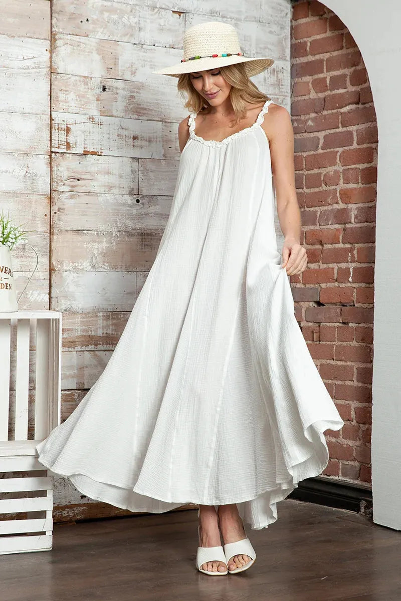 Elevate your boutique's summer collection with our ethereal Flowy Ruffle Strap Maxi Dress. Crafted from lightweight cotton with a breathable texture, this versatile maxi features delicate ruffle straps and a relaxed silhouette that your customers will adore. Perfect for beach vacations, summer brunches, or styled for evening events – this dress offers the ultimate blend of comfort and effortless elegance.