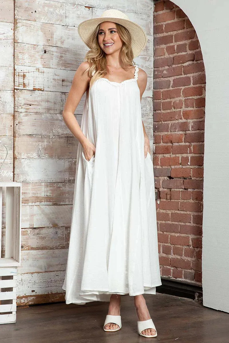 Boho Flowy Cotton Ruffle Strap Pockets A-Line Maxi Dress