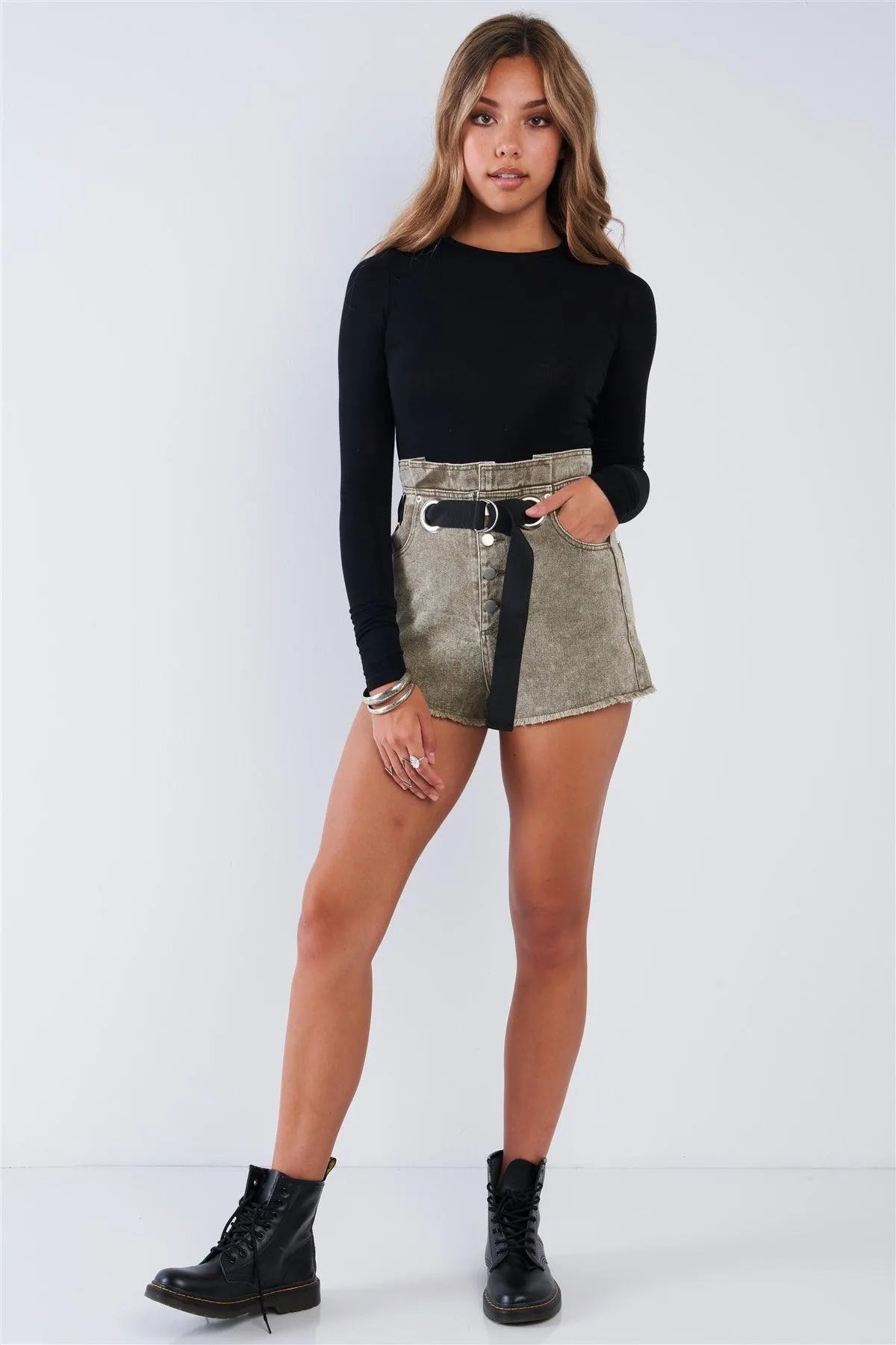 High Waisted Olive Washed Denim Shorts With Black D-Ring Belt Frayed Hem /3-2-1