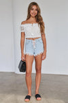 🖤 Short Features: Washed denim, high waisted, front pockets, back pockets, white lace up crotch, belt loops, stretchy, tight fit, frayed hem, summer, mini length, high quality denim.