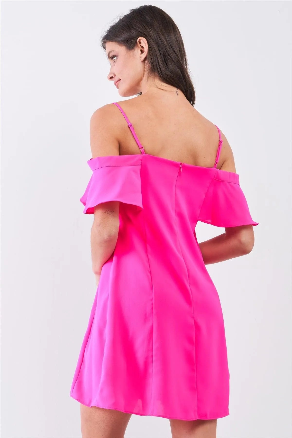 Hot Pink Cold Shoulder Ruffle Mini Shift Dress /1-2-3