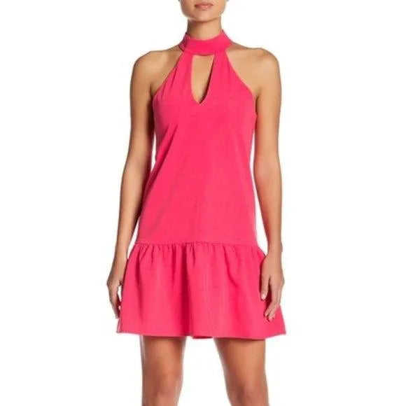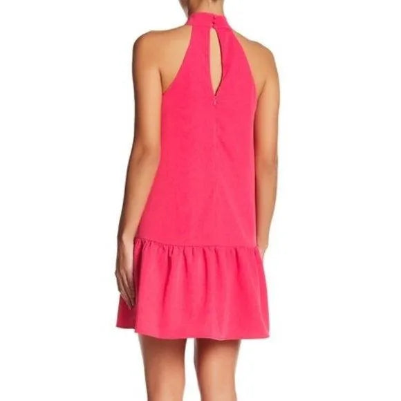 Hot Pink Sleeveless Halter Neck Keyhole Flounce Hem Mini Dress