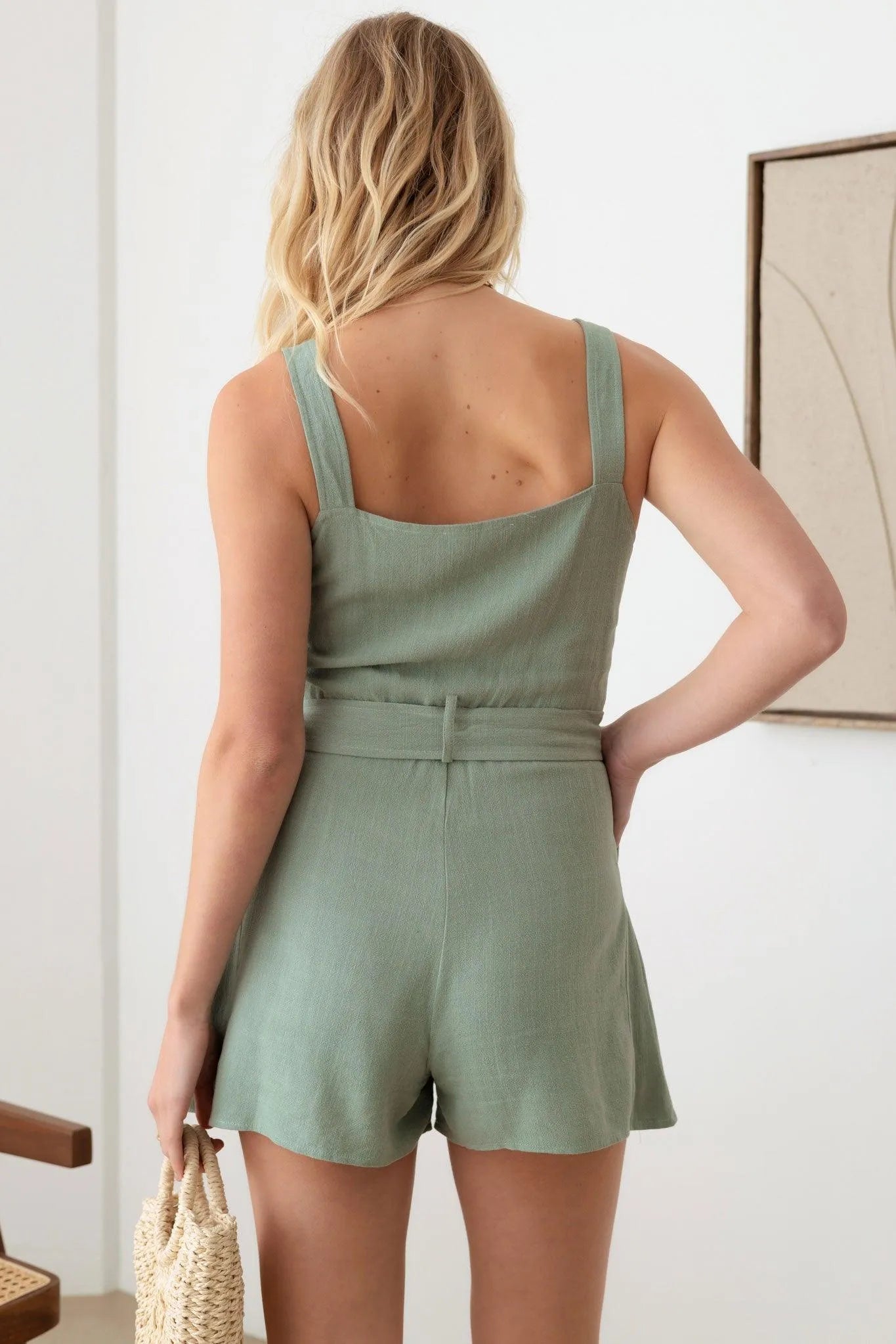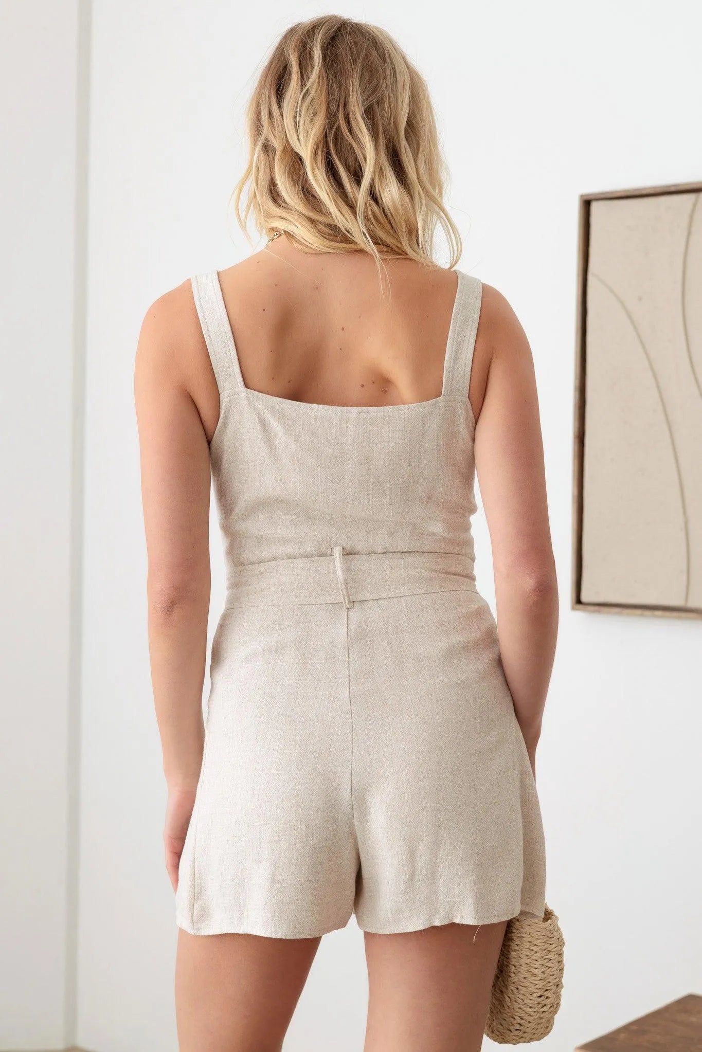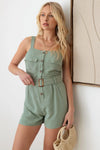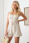 Linen Blend Button-Up Short Sleeve Belted Utility RomperVendor:HYFVE