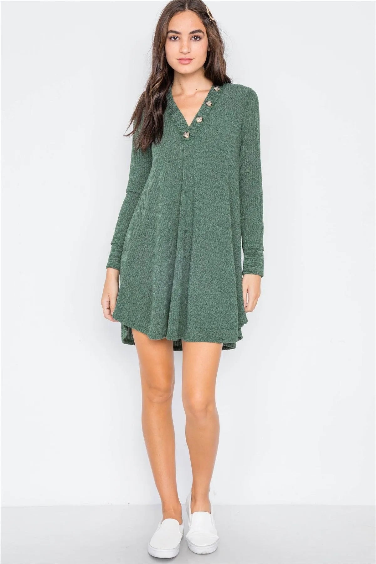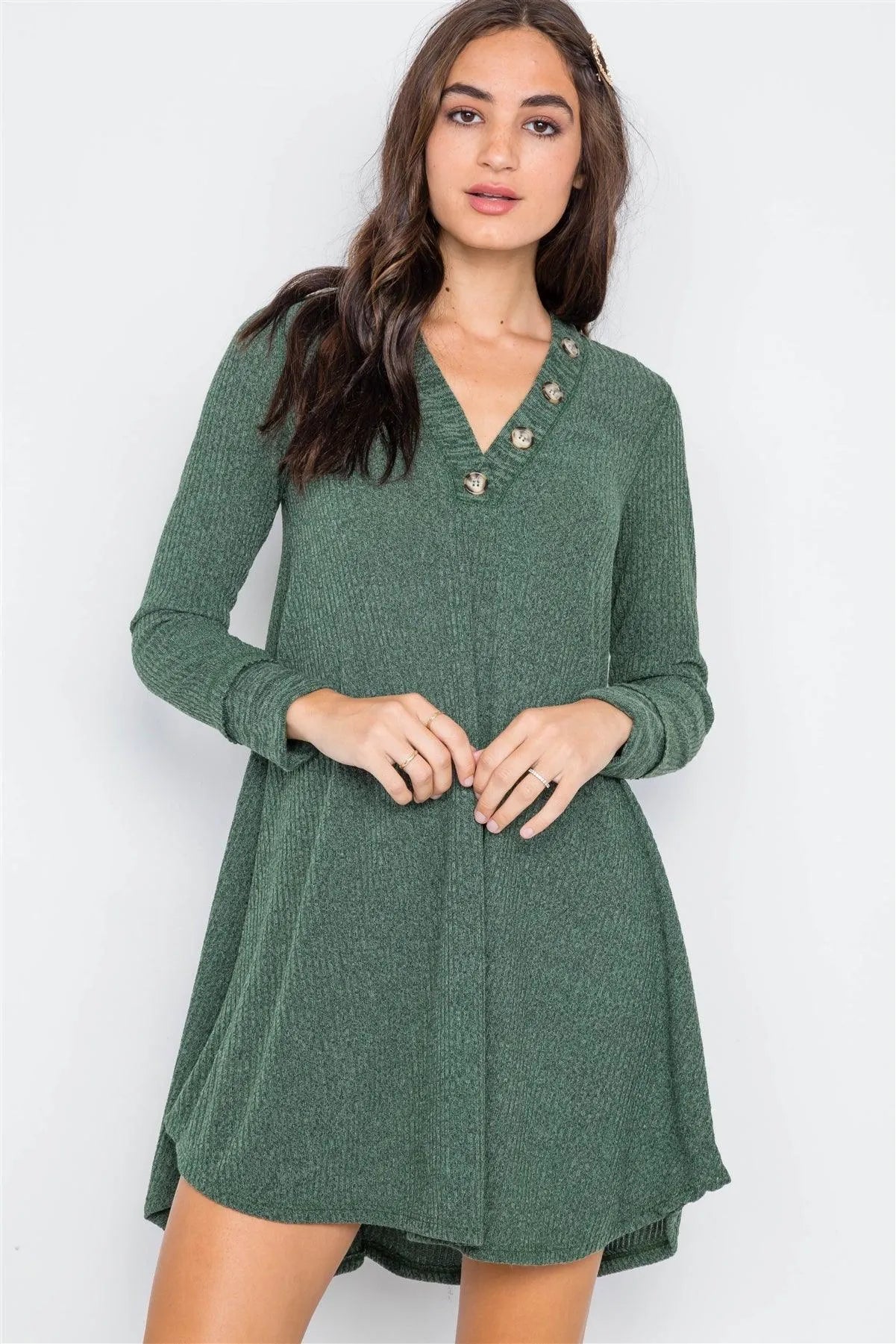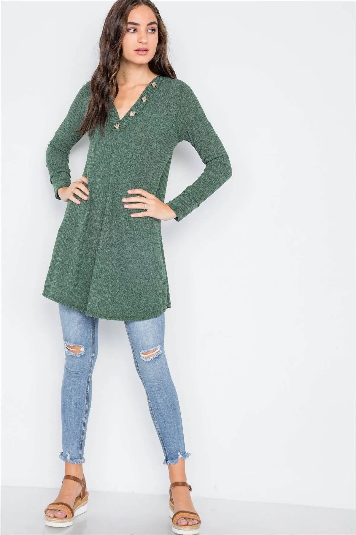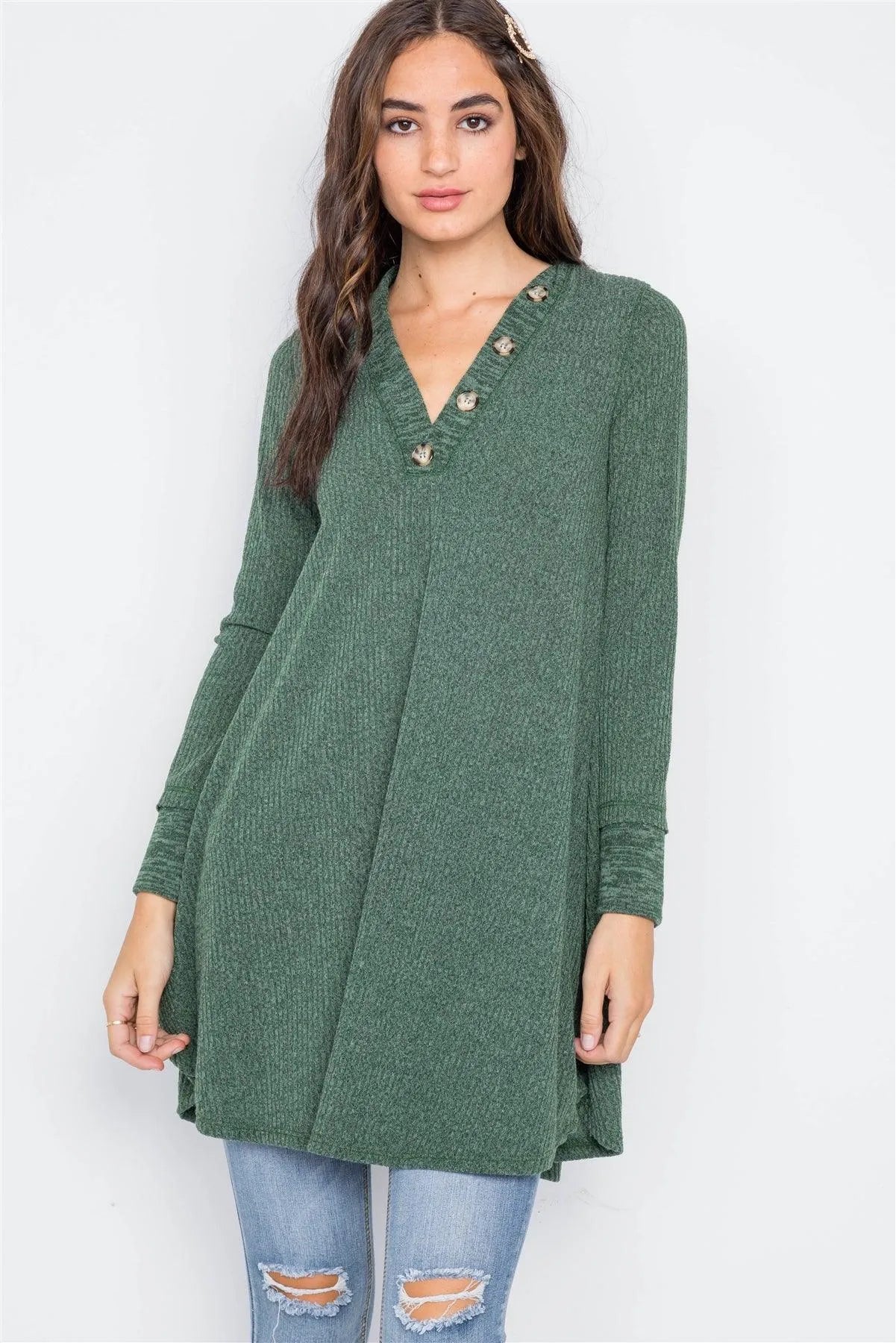 Sweater features: long sleeves, button front detailing, V-Neck, ribbed, A-Line silhouette, circled hem Model is 5'9 wearing a size Small (Waist: 24", Bust: 32A, Hips: 34")Size Small Item Measurements: Length: 34", Bust: 36", Sleeves: 22"True to size