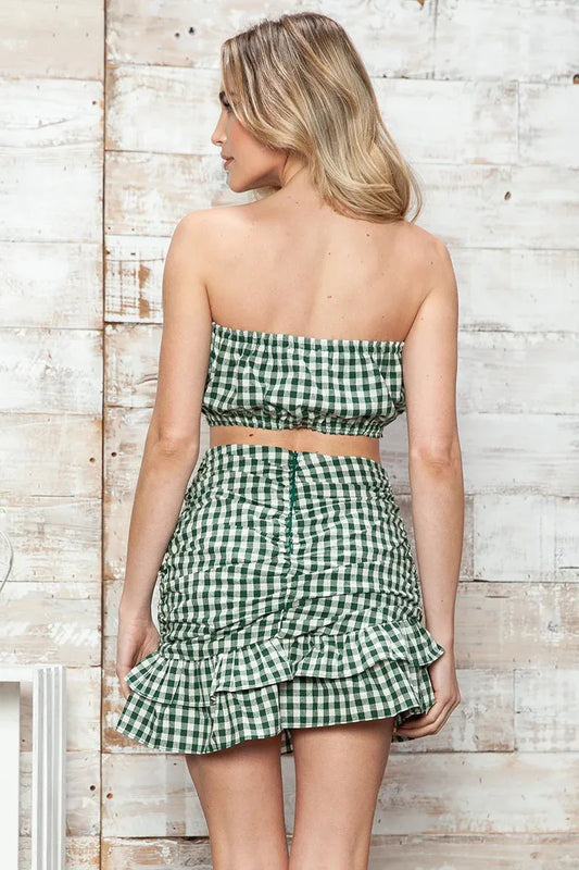 Gingham Strapless Ruched Two-Piece Crop Tube Top and Mini Skirt SetVendor:Mable