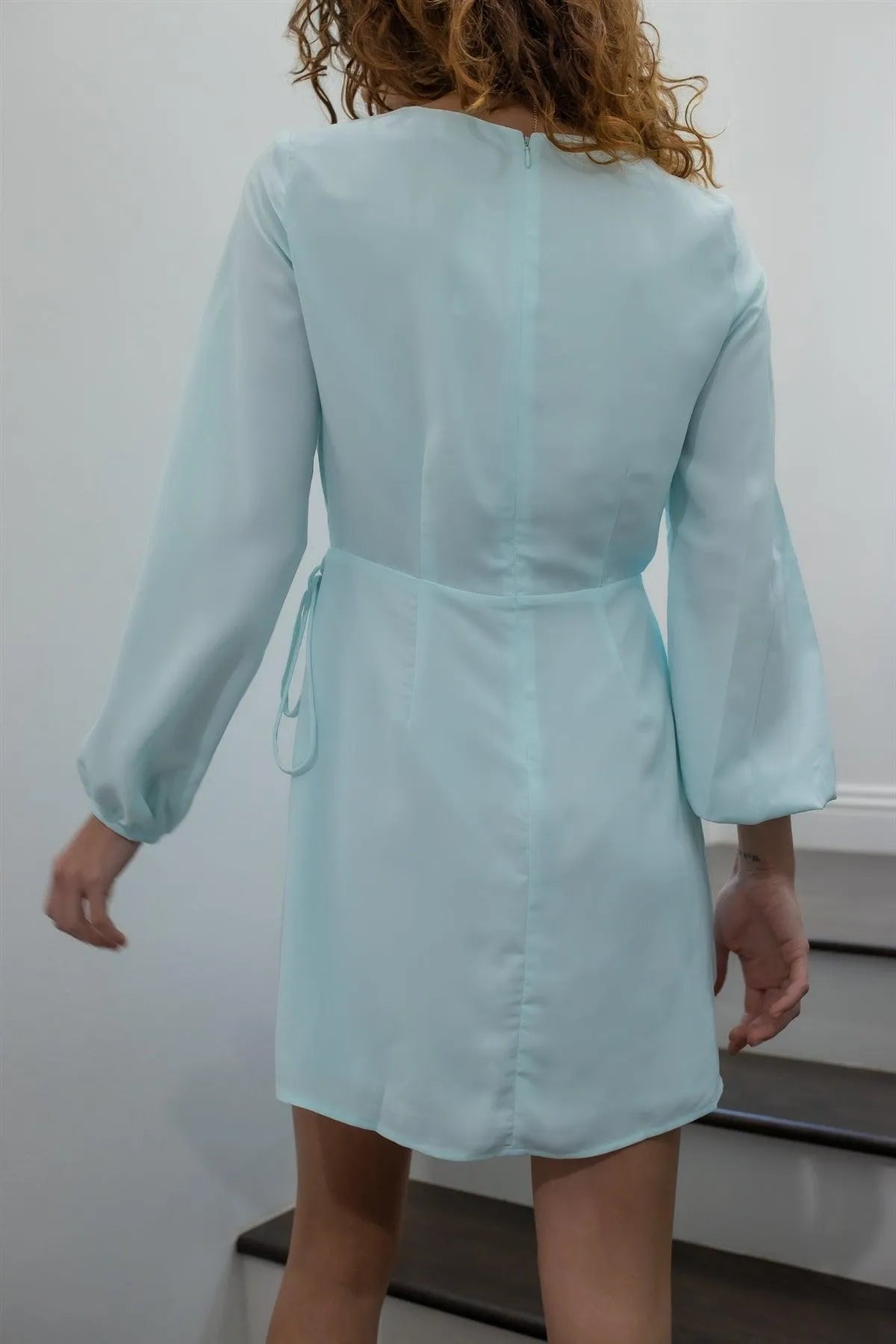 🖤 Item Features: Ice blue, solid color, wrap side self-tie detail, long balloon puff elasticized cuff sleeves, v-neckline, back hidden zip and hook & eye closure, mini length, lined, non-stretchy, fitted waistline, casual, girlish, trendy, summer vibe, cute, chic