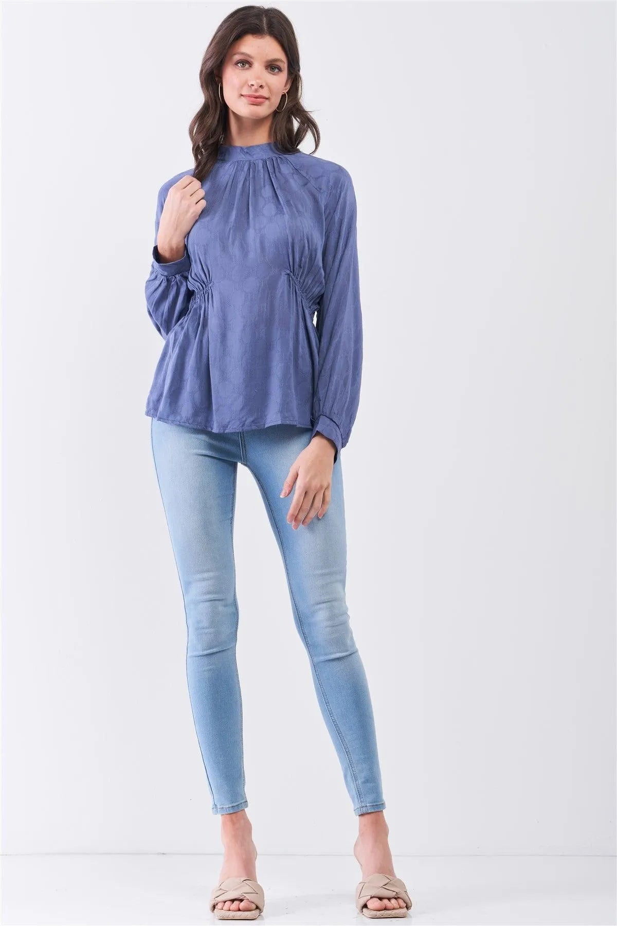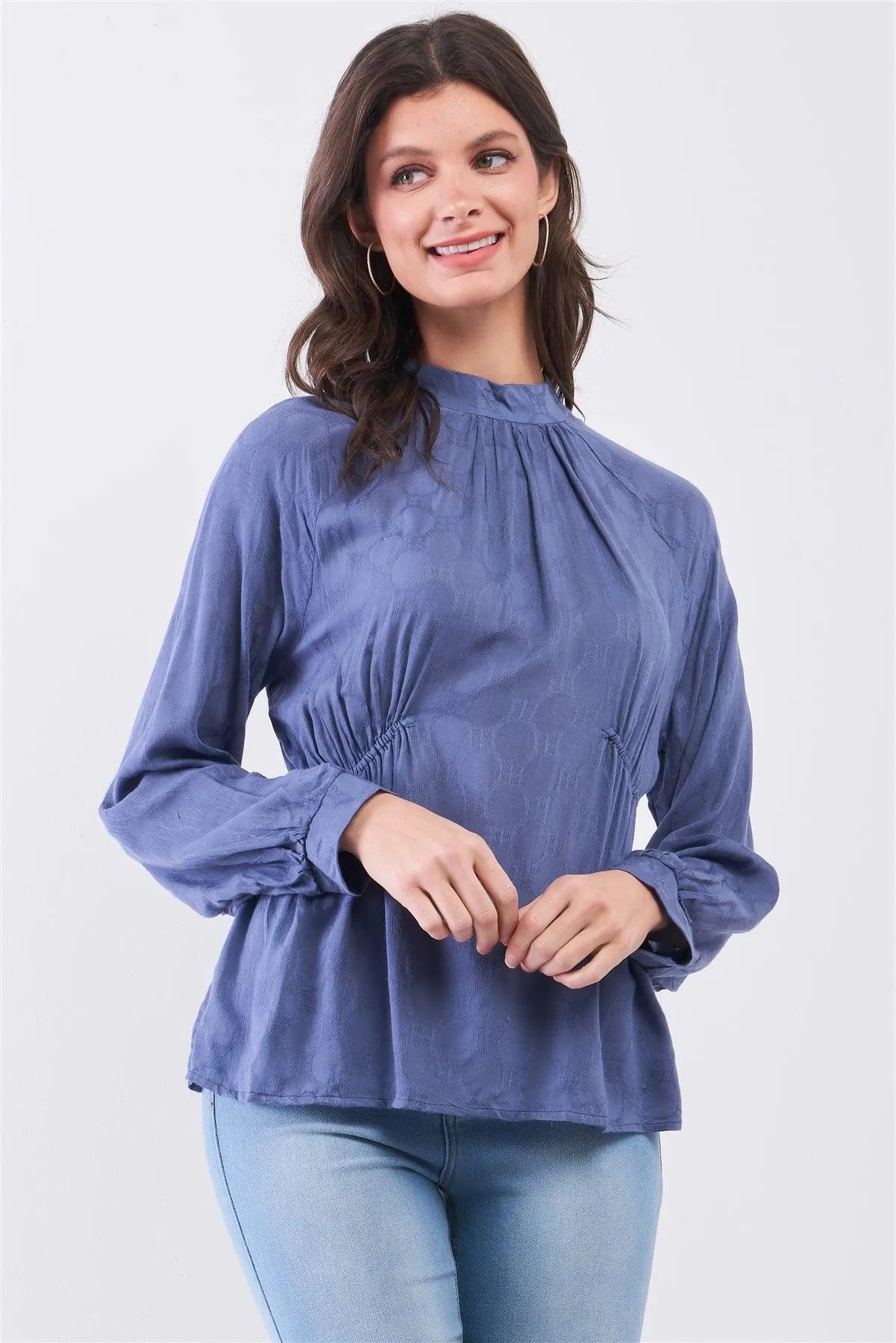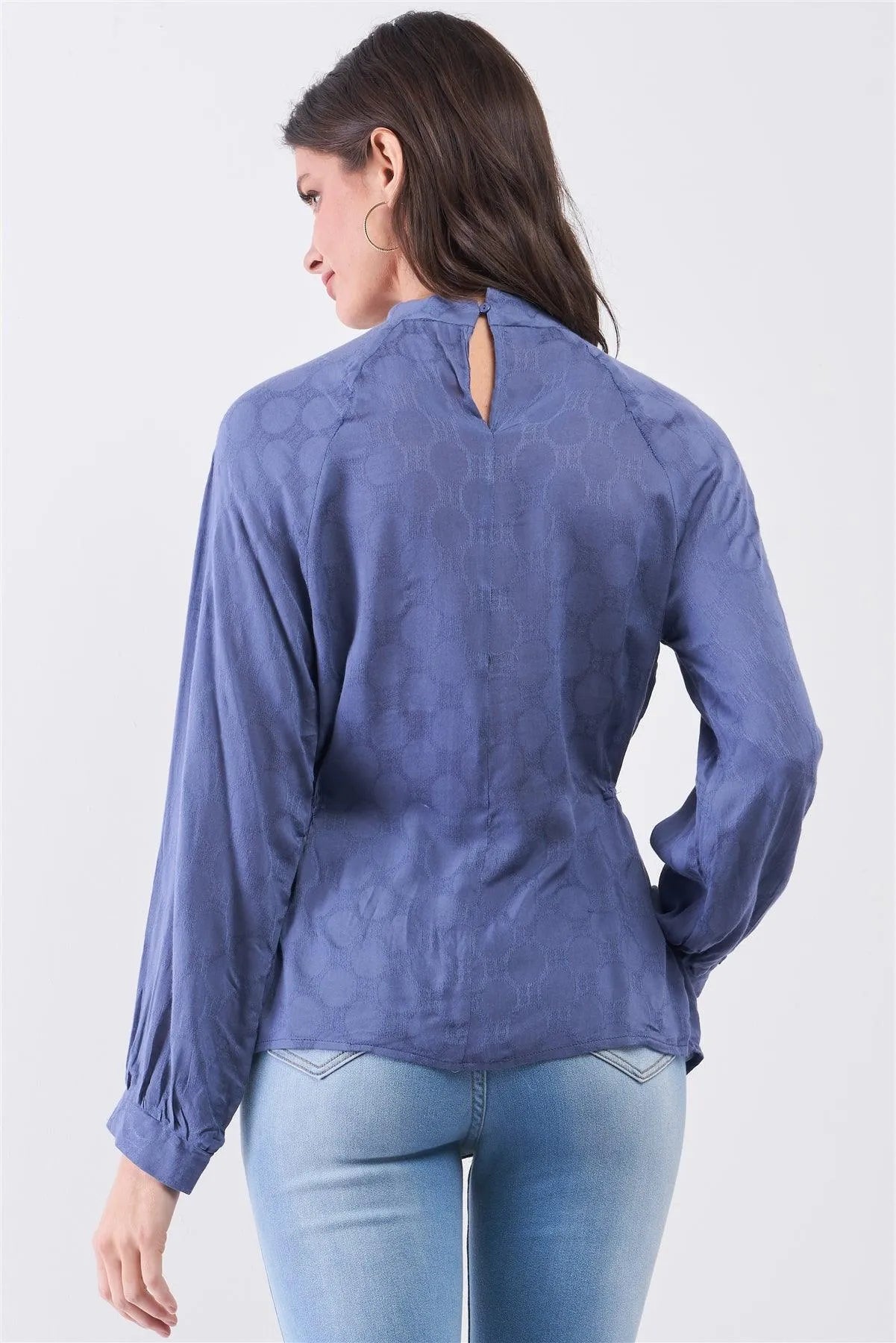 🖤Item features: Indian Blue, solid color, circular pattern print, mock neck detail with back button loop closure, long slightly ballooned sleeve, stretchy stitched detail, relaxed fit, unlined, semi-sheer, non-stretch, casual, soft to touch, boho, country style, comfy, breathable, trendy, fall/winter collection