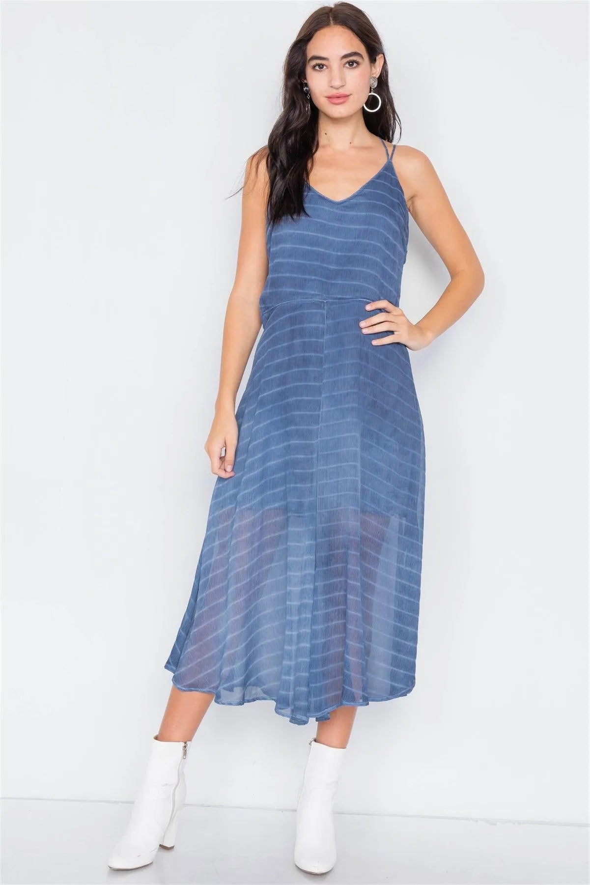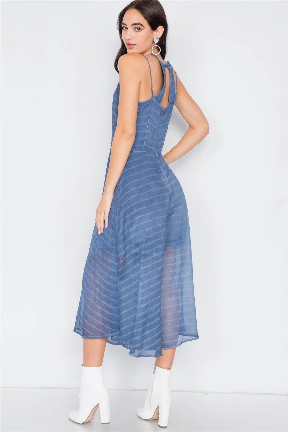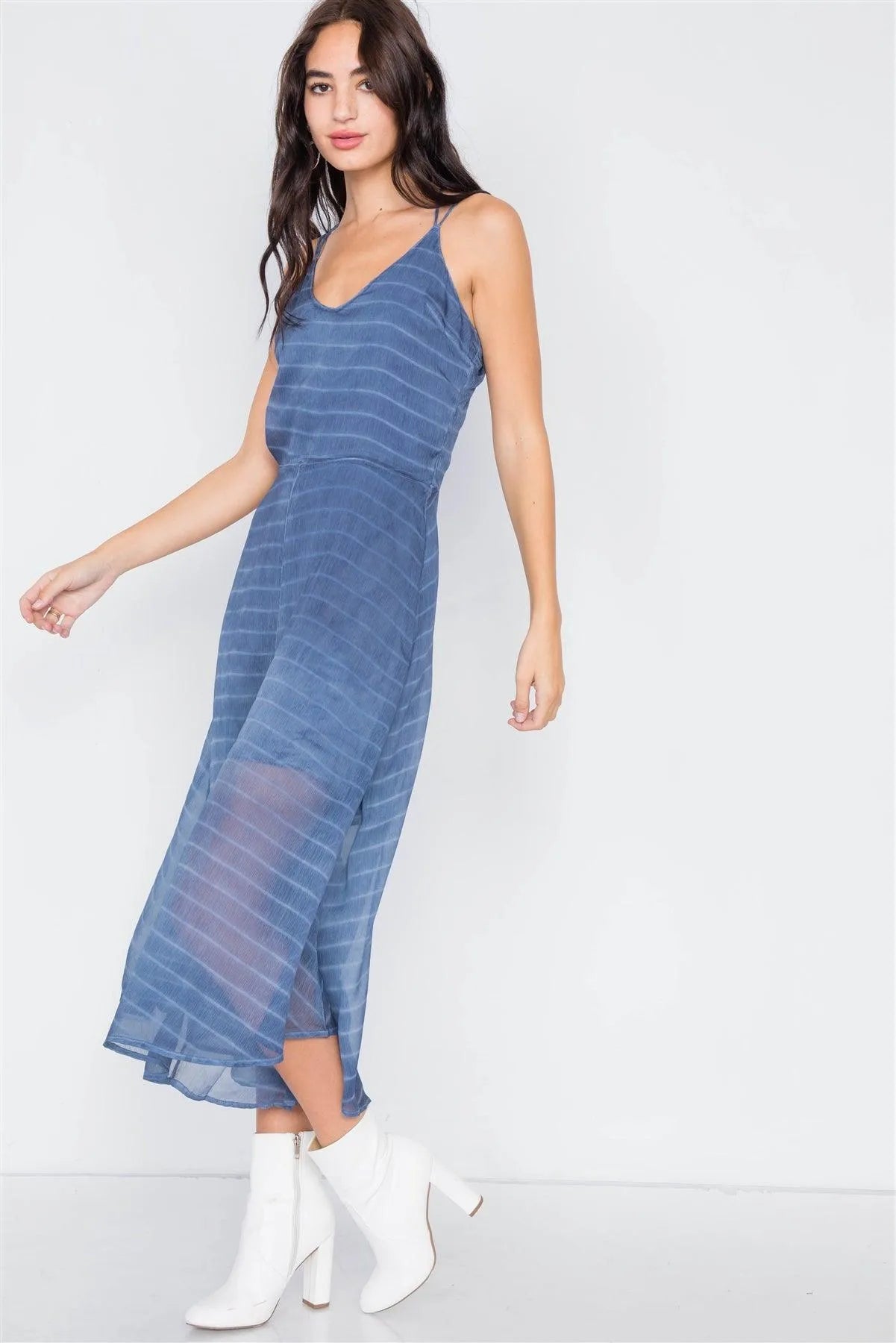 Indigo Blue Contrast Stripes Sheer Flare Leg Jumpsuit /2-2-2