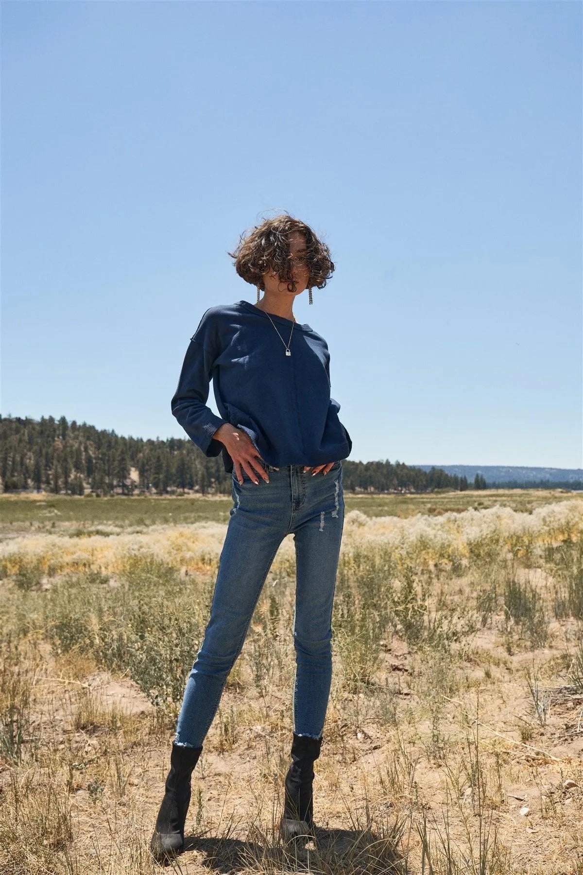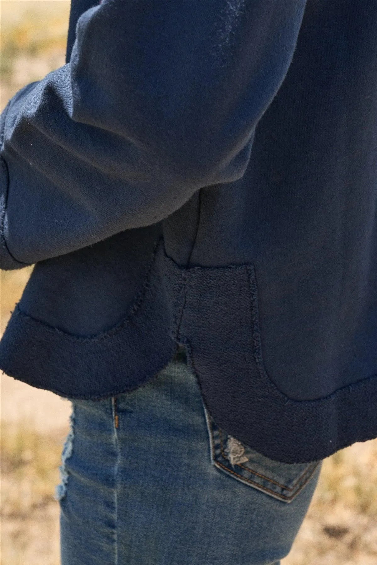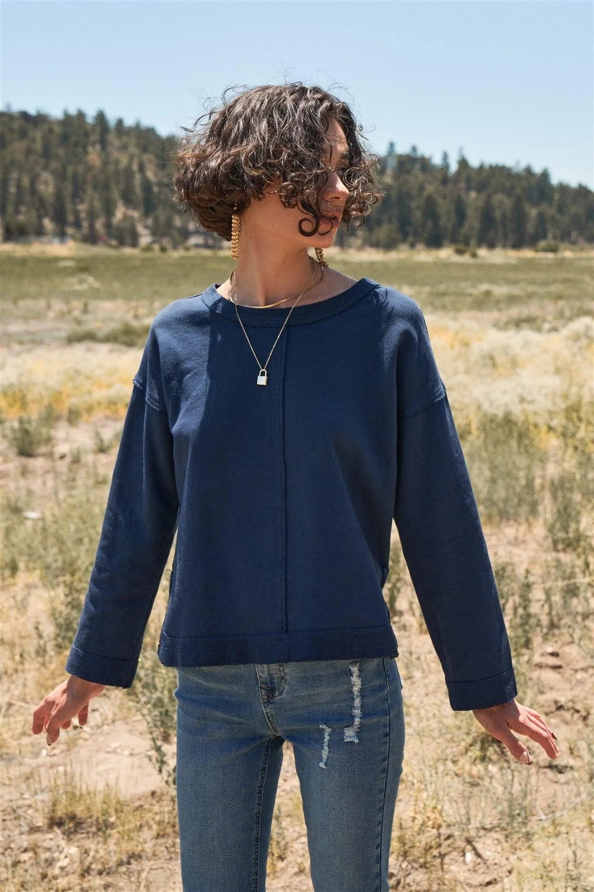 🖤Item Features: Indigo, solid color, inside out, long sleeve, dropped shoulders, side slit, round neckline, semi-stretchy, unlined, 100% cotton, casual, comfy, basic, fall/winter collection