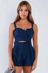 Indigo Linen Sweetheart Ruffled Neckline Crop Top High Waisted Cinched Shorts Two Piece Set /3-2-1