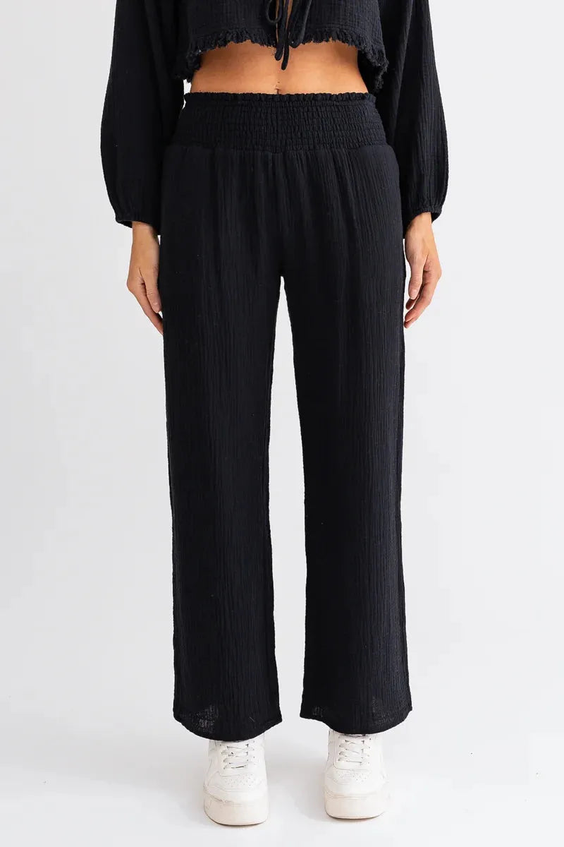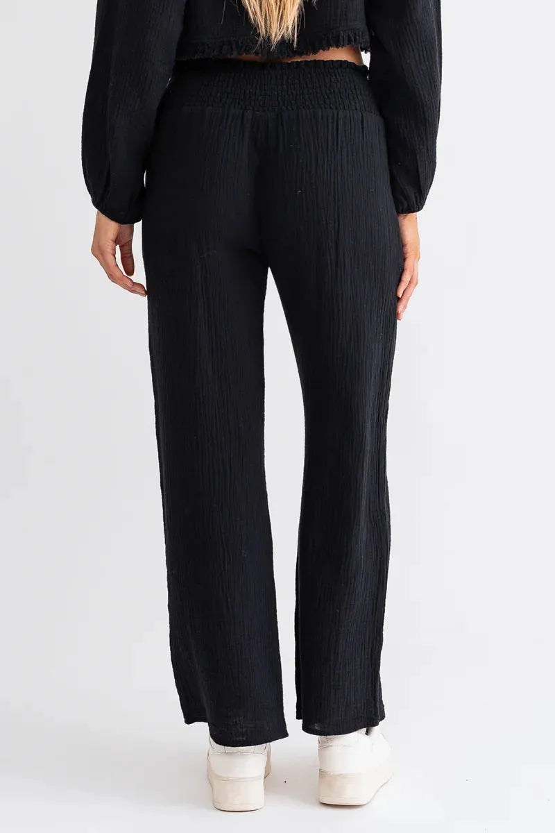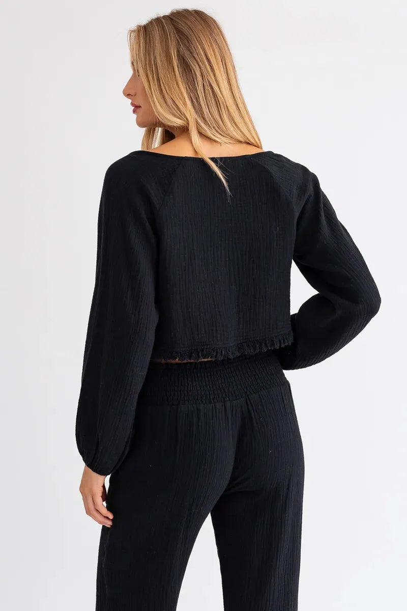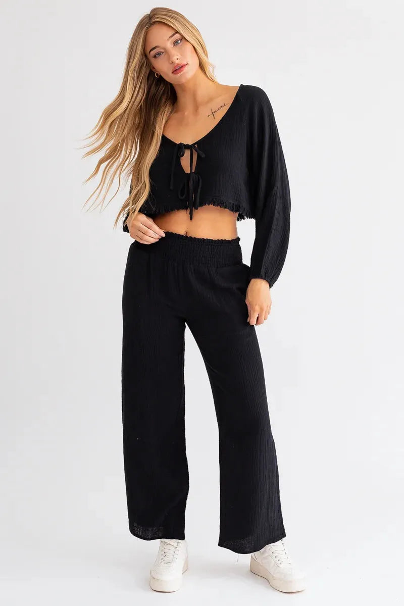 Women set, solid color, crop length, frayed hem, long wide sleeve, v-neckline, front tie, long relax pants, smoked waistline, cool and chic! this two piece set exudes confidence and femininity effortlessly