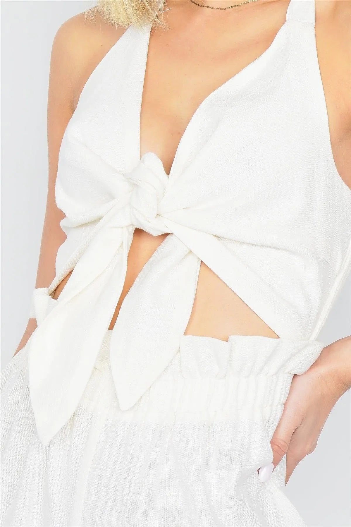 Linen Blend Button-Up Short Sleeve Belted Utility RomperVendor:HYFVE