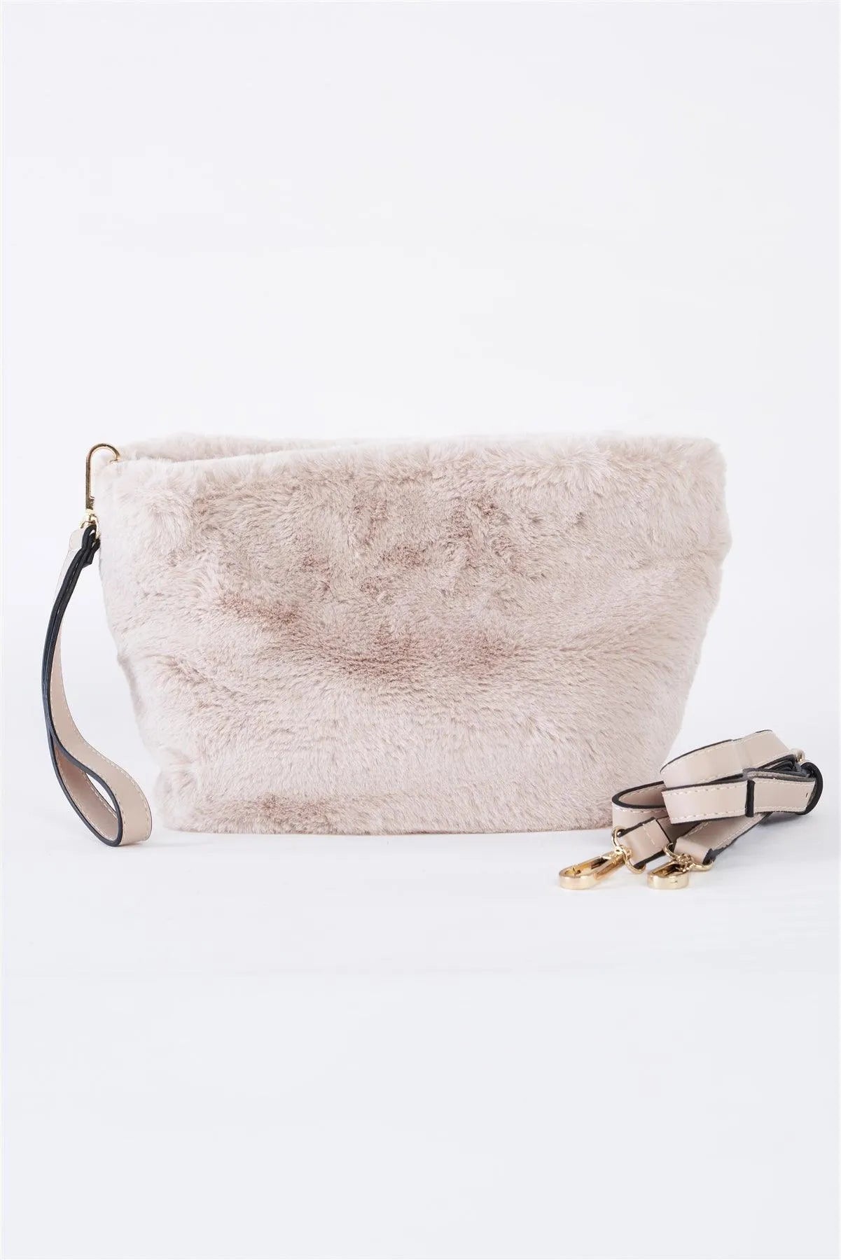 Ivory Faux Fur Hidden Magnetic Snap Button Closure Crossbody Bag / Clutch With Hidden Hand Strap Loop / 1 Bag