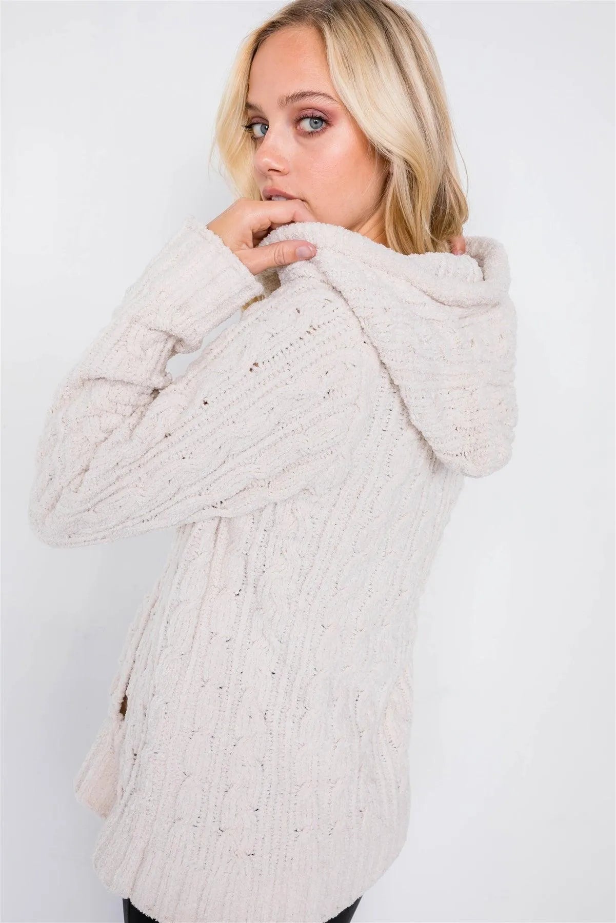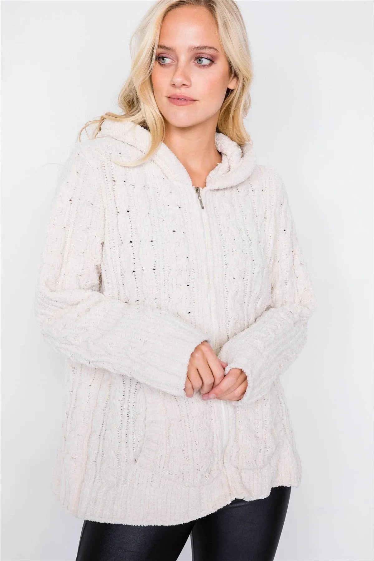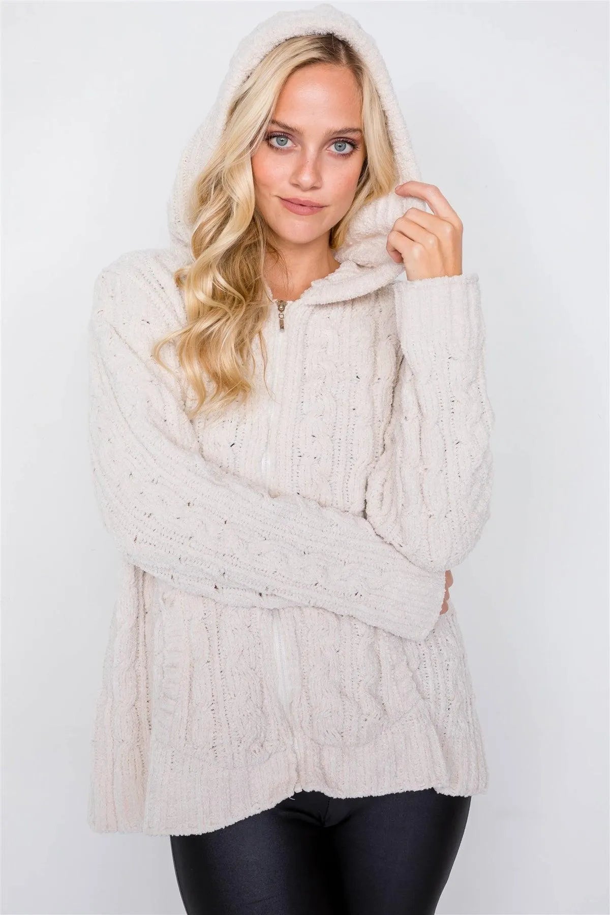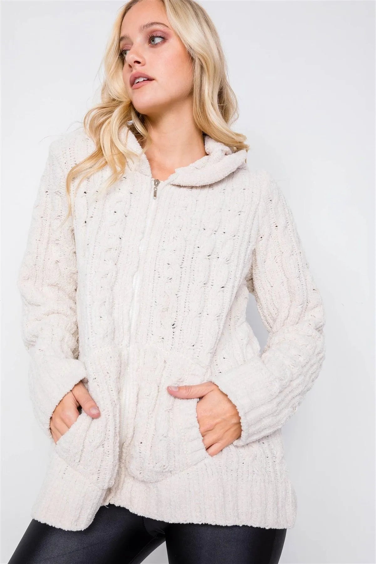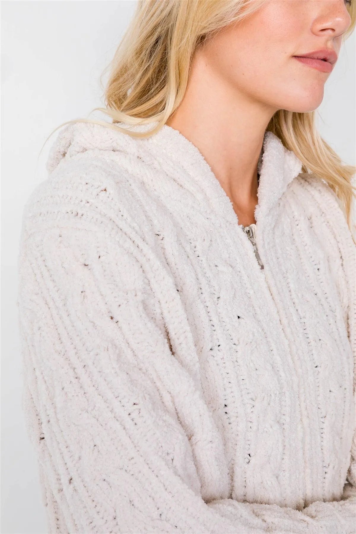 Ivory Knit Suede Front Zipper Hoodie Sweater /3-3