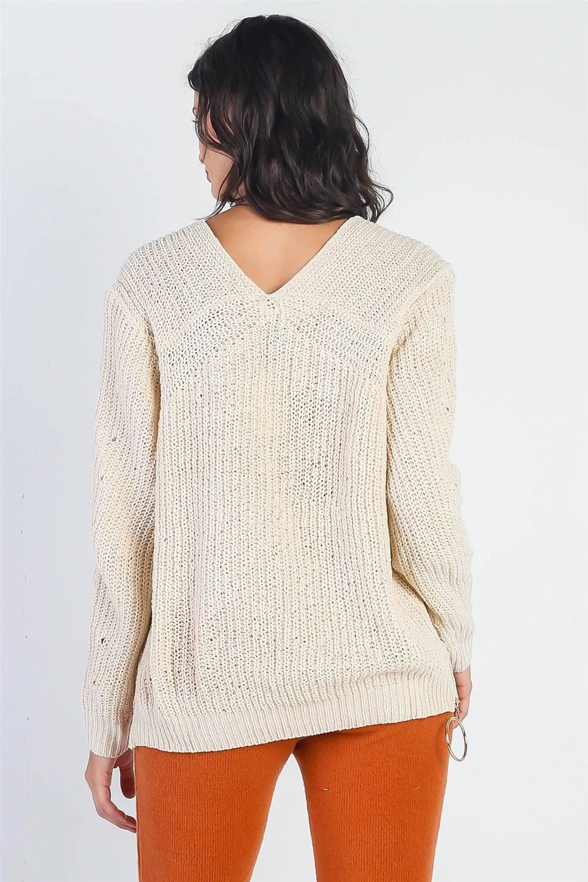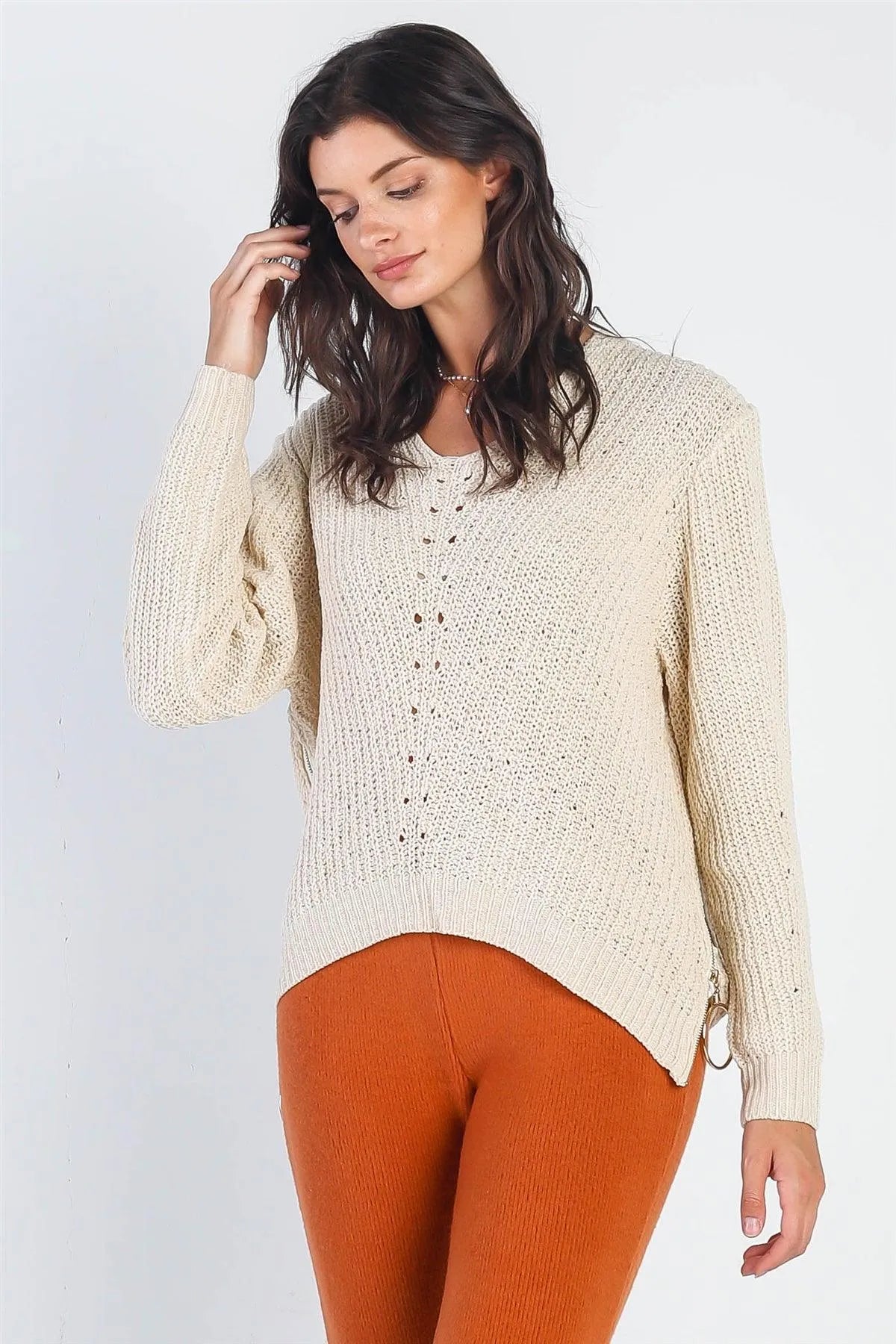 🖤 Item Features: Ivory, knitted, cuffs long sleeve & hem, zip-down side hem details with o-ring, v-neckline, relaxed fit, semi-stretchy, not see through, unlined, cozy and comfy, warn, casual, fall/winter collection