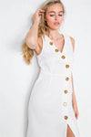 Dress features: front button detail, bust darts, solid, medium sides slits, midi length, v-neck, some stretch, unlined.Model is 5'8 wearing a size Small ( Waist: 26", Bust: 32B, Hips: 34")Item Measurements: Length: 41", Bust: 30"True to size