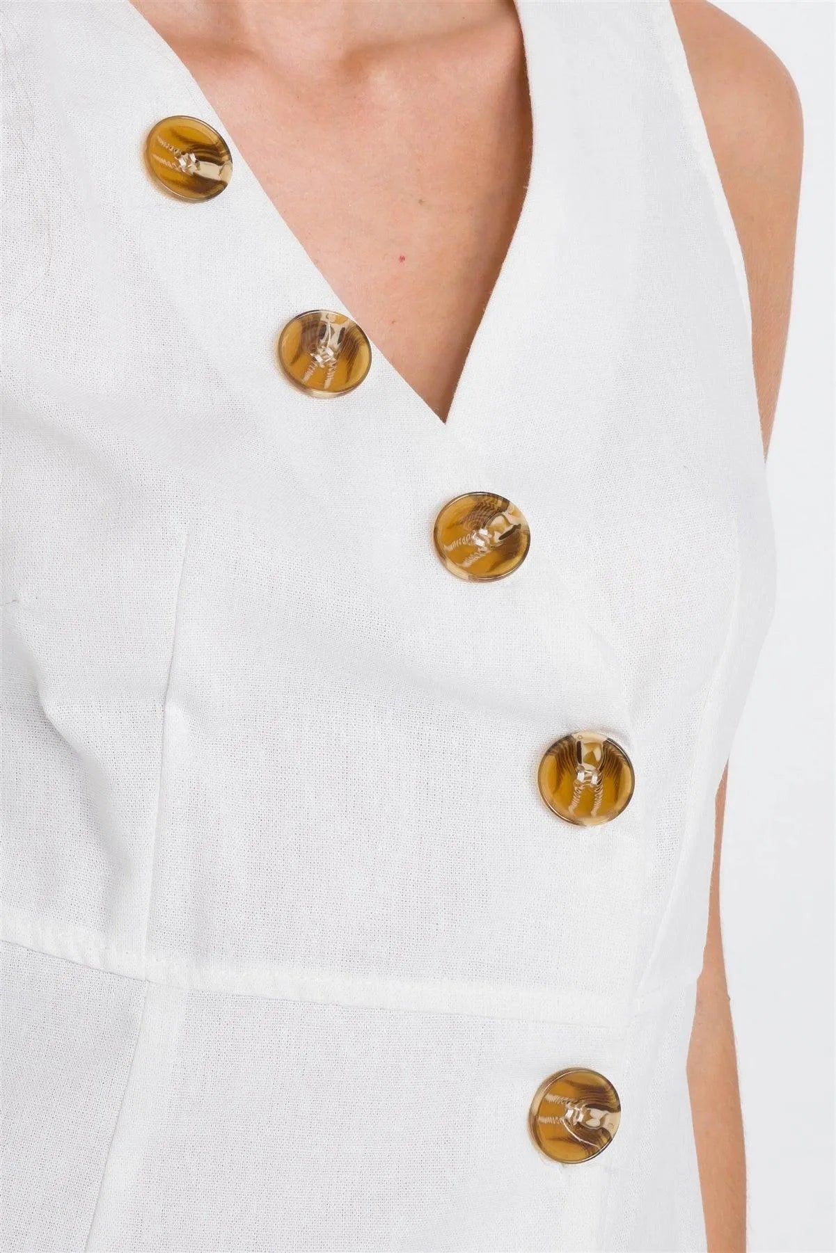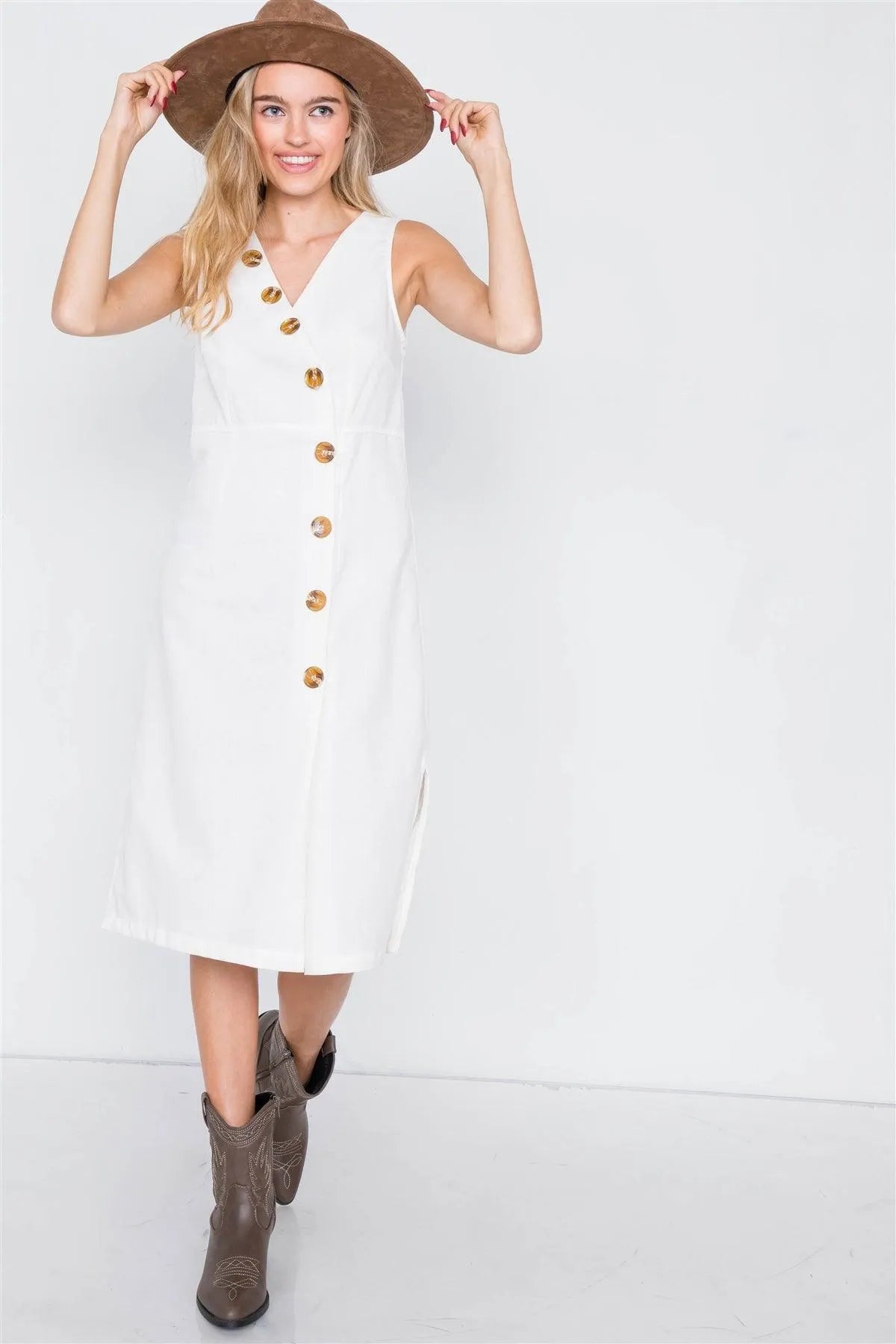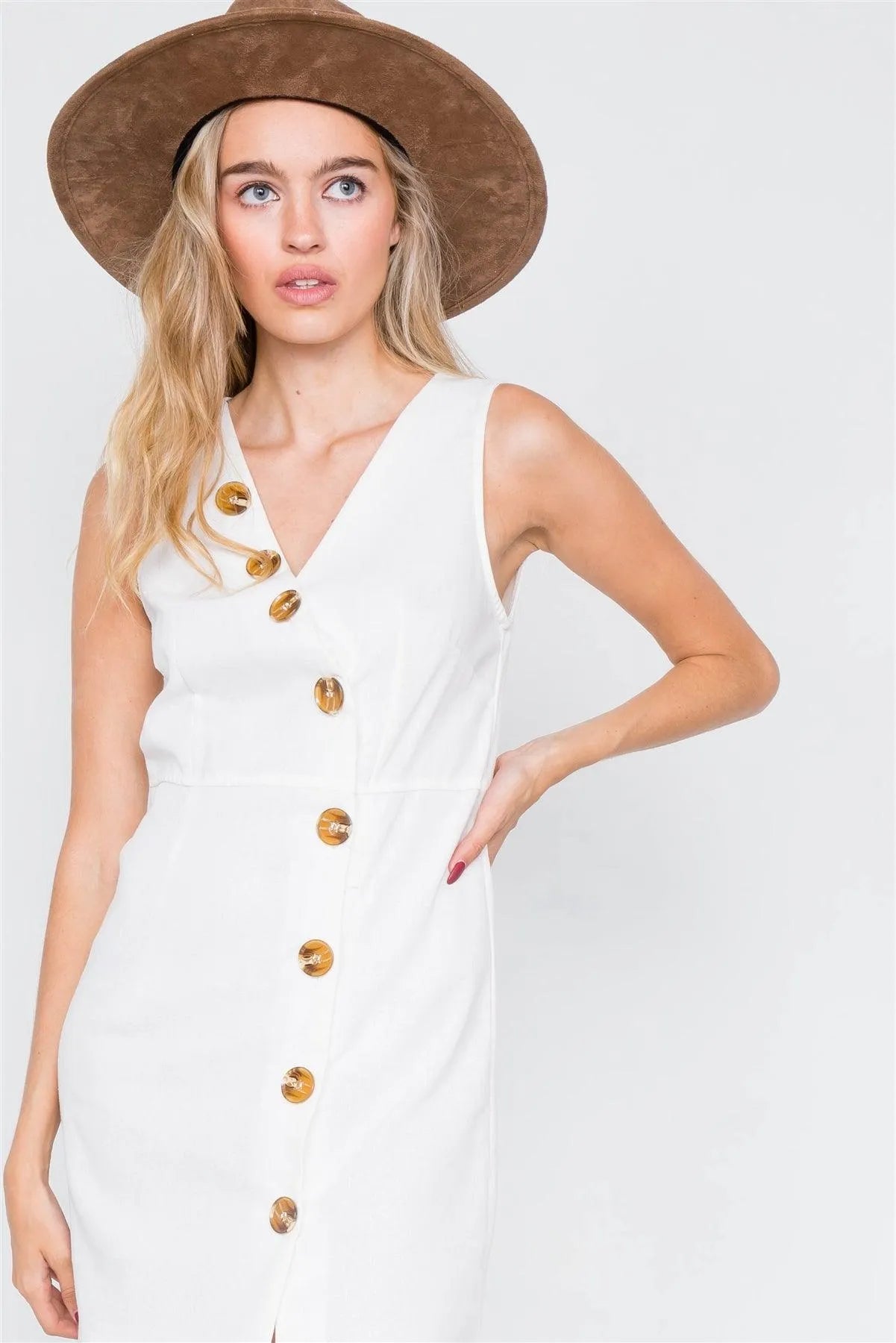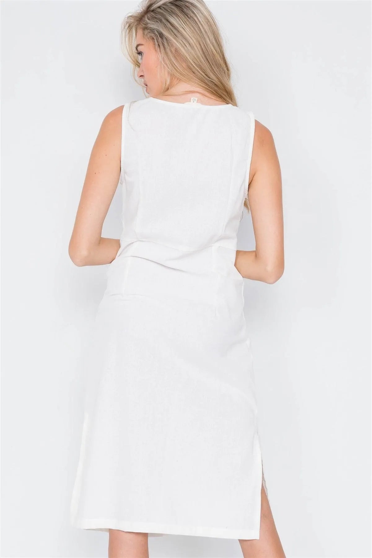 Ivory Linen-Blend V-Neck Midi Dress /2-2-2