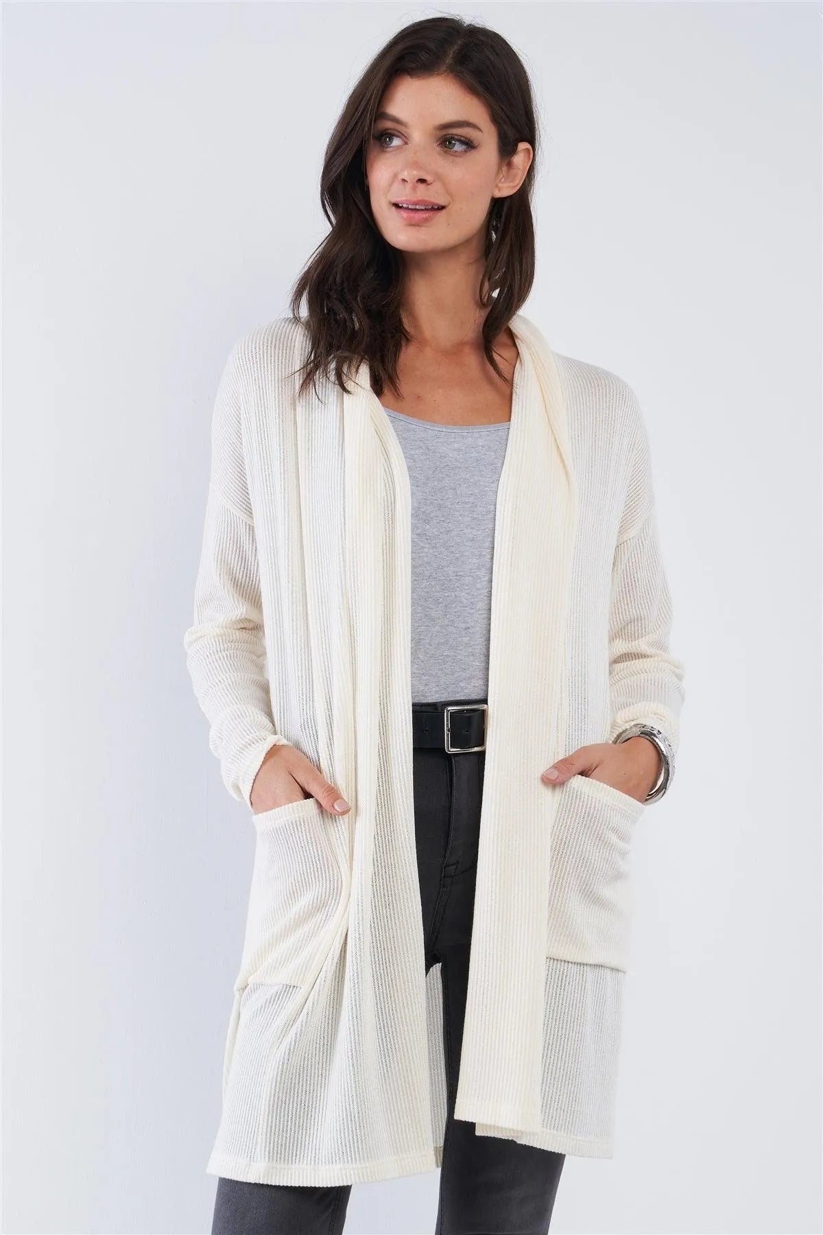🖤 Item features: Ivory, solid, ribbed small thread knit structure, long sleeve, two large square side pockets, open front, semi-sheer, unlined, minimalistic, casual, lounge, fall/winter wear