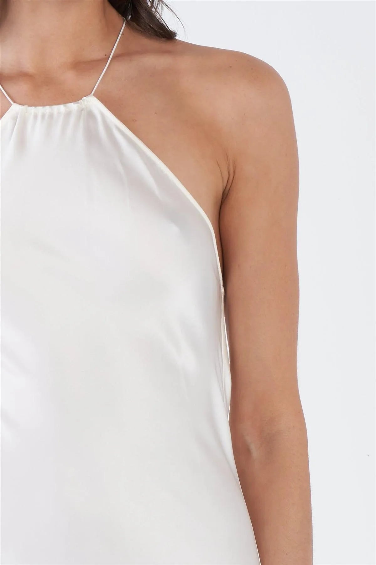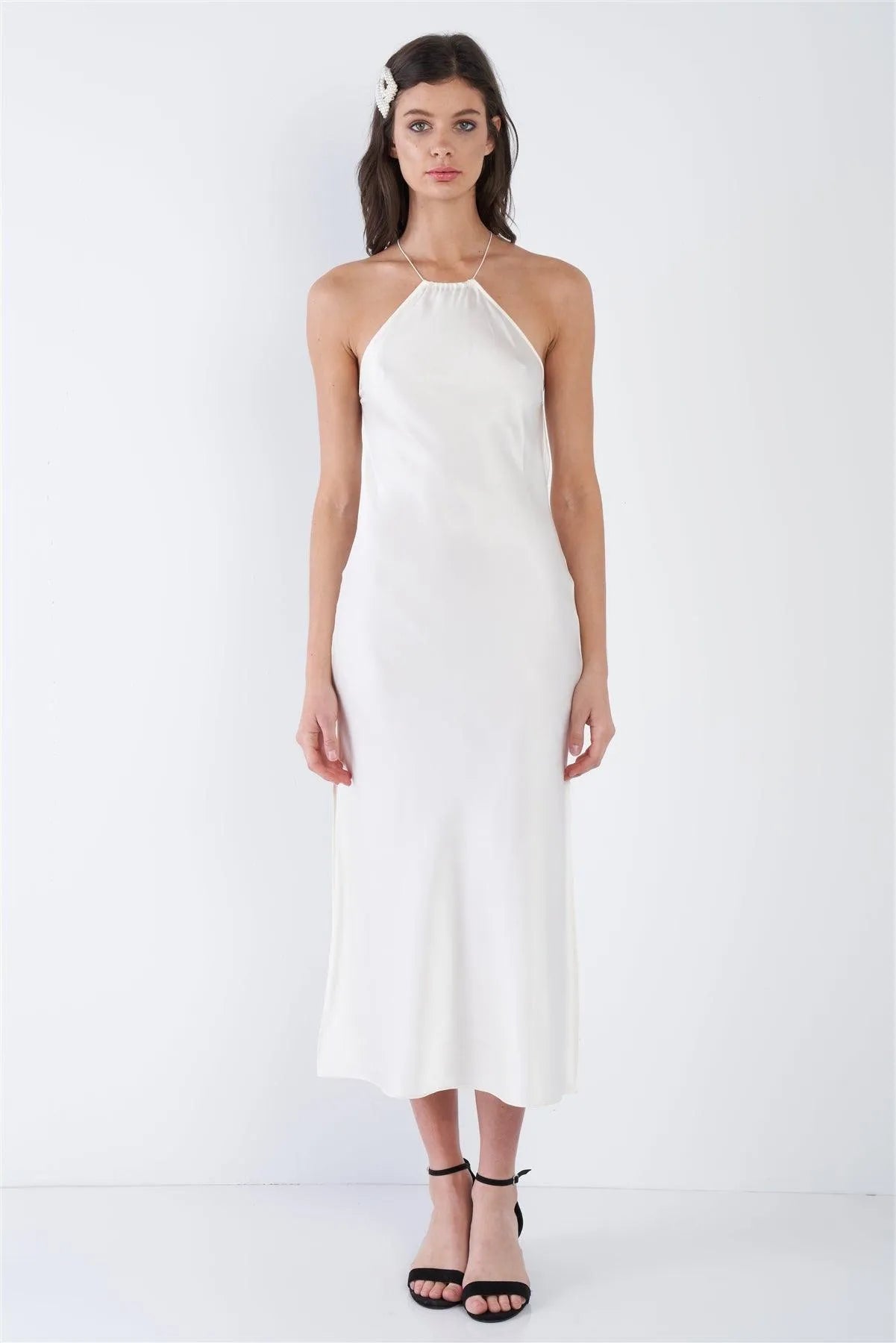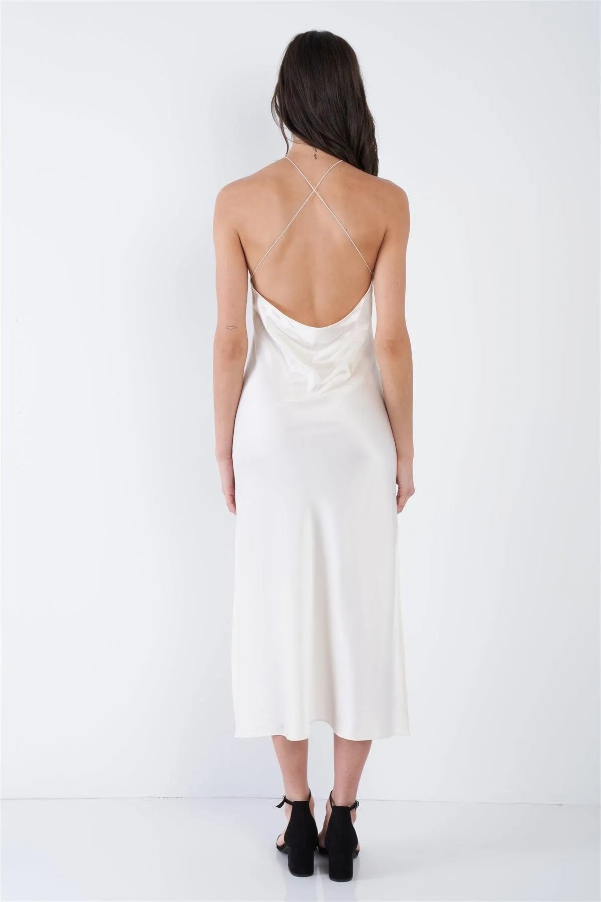 Ivory Silk Halter Side Slit Criss-Cross Open Back Midi Dress /3-2-1