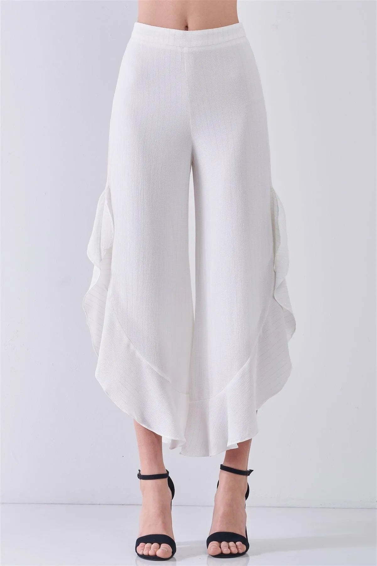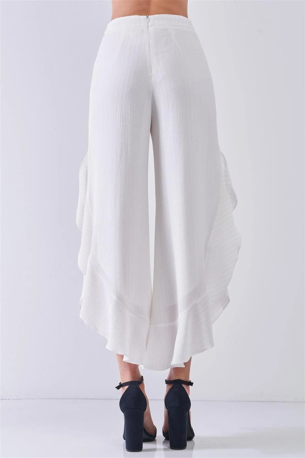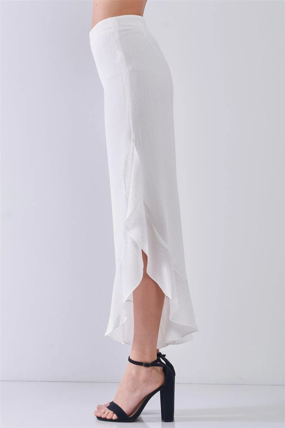 Ivory Silver Striped High-Waisted Ruffle Side Slit Midi Pants /3-2-1