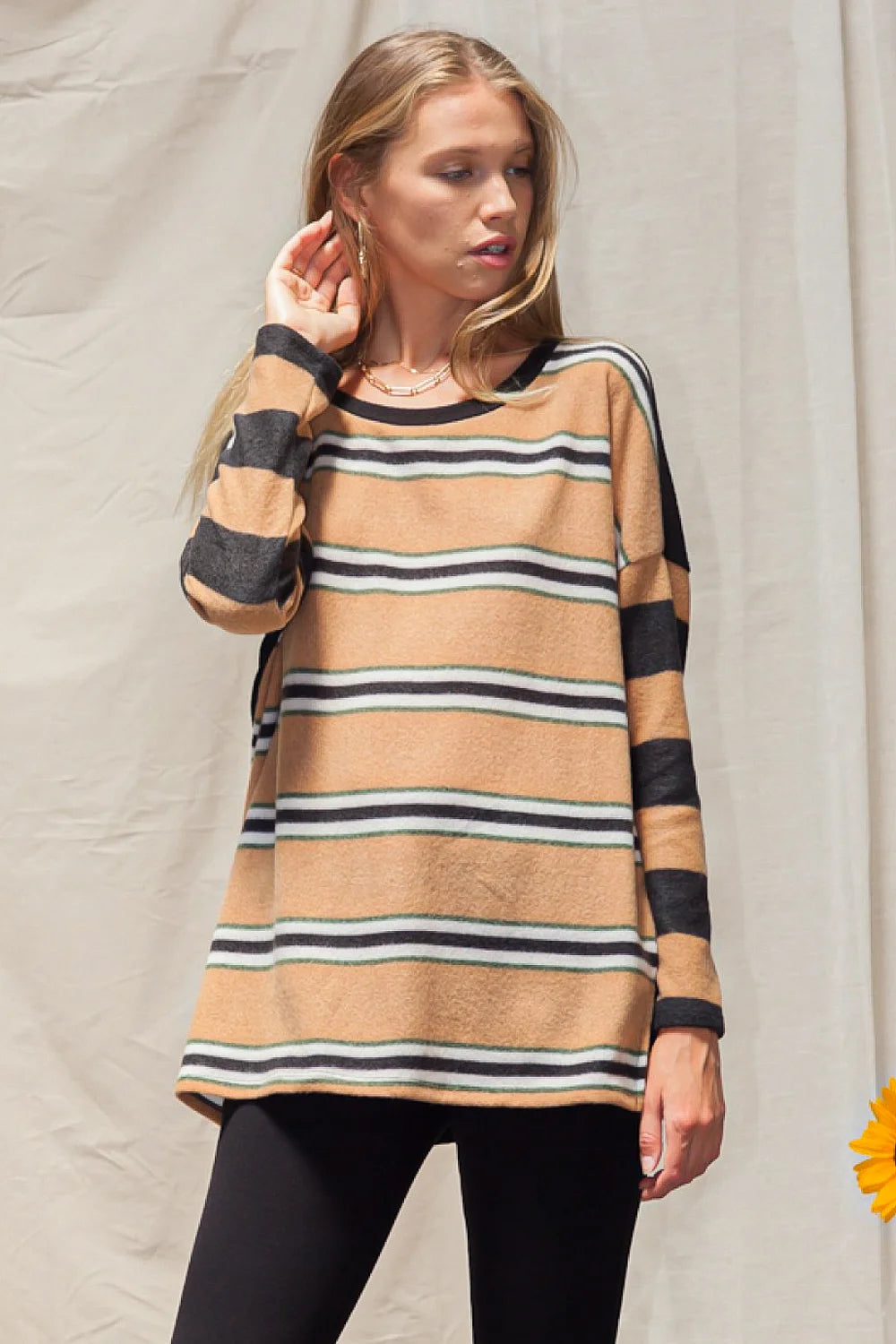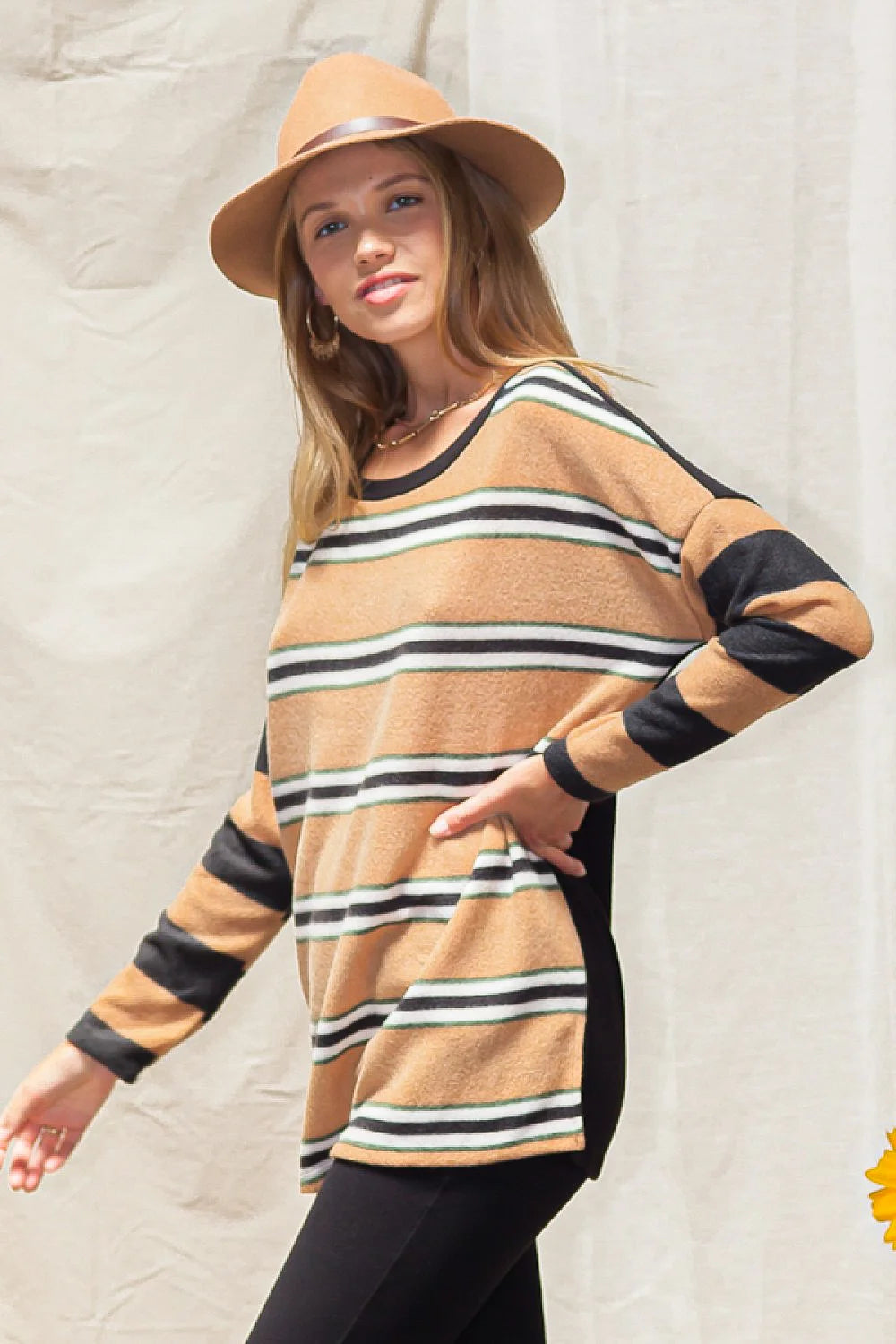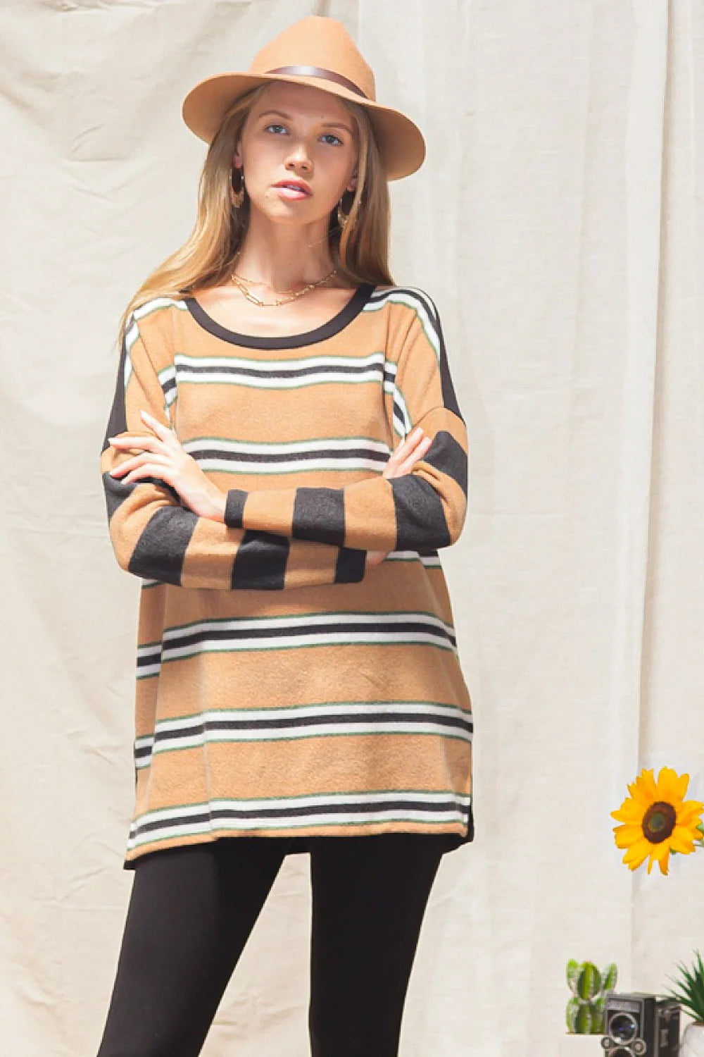 Transform your boutique inventory with our Plus Size Striped Sweater—a cozy oversized knit top that's flying off the shelves! This relaxed fit sweater features eye-catching horizontal stripes in bold color combinations, a flattering scoop neckline. Available in striking colorways like black with coral and cream stripes and camel with black stripes, this versatile sweater top is designed for boutique owners seeking wholesale plus size clothing that combines comfort with effortless style. Your customers will love the soft knit fabric and figure-flattering oversized silhouette that makes this piece a wardrobe essential!