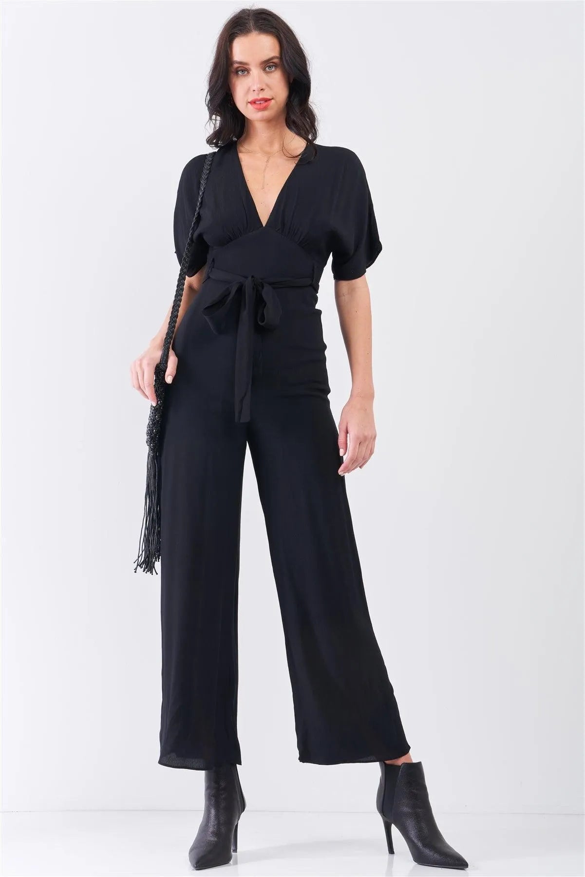 Jet Black Solid V-Neck Angel Sleeve Self-Tie Waist Detail Wide Leg Jumpsuit /3-2-1