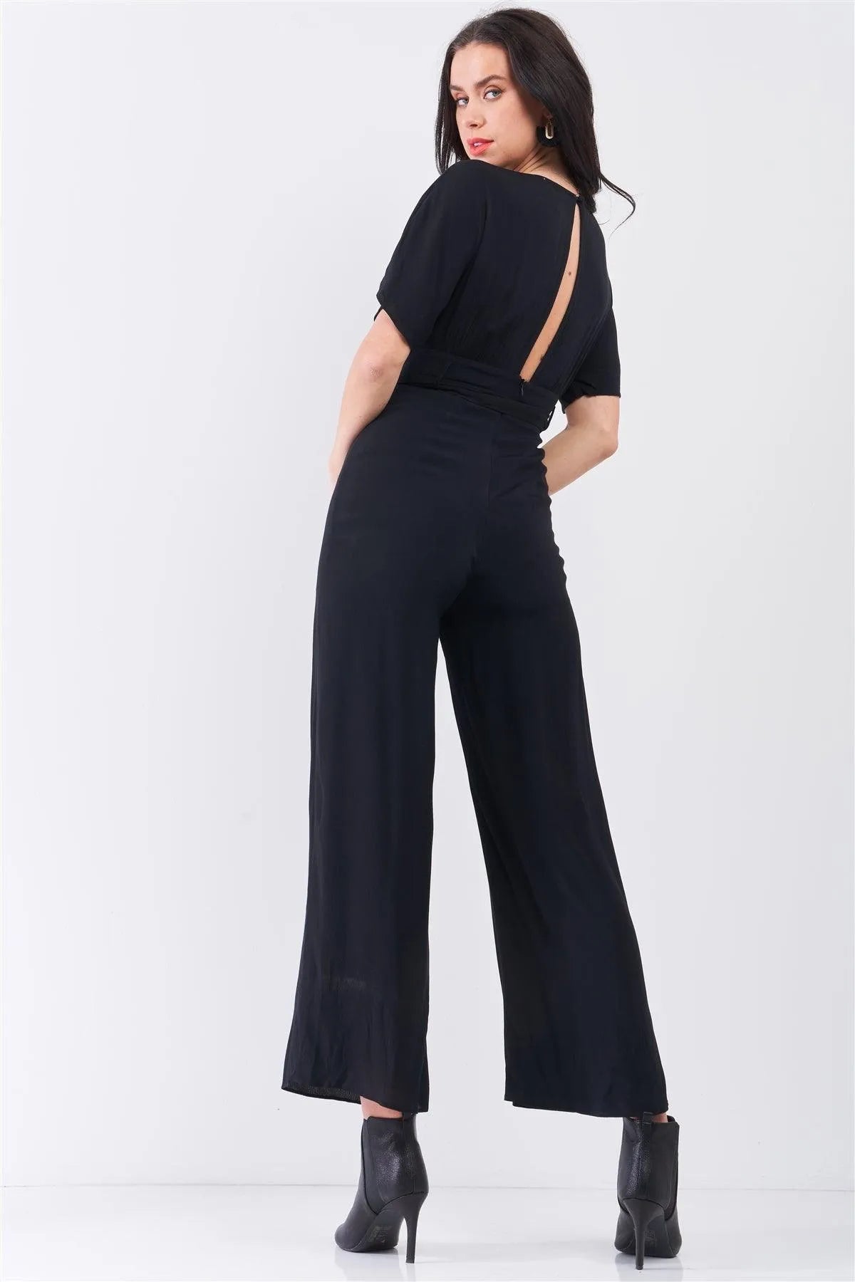 🖤 Item Features: Jet black, solid color, short angel sleeve, plunging V-neckline with back button loop closure, back bottom zipper closure, self-tie waist with detachable belt and belt loops, wide leg cut, partially lined, non-stretch, regular fit, casual chic, business casual, elegant, party wear, spring/summer collection