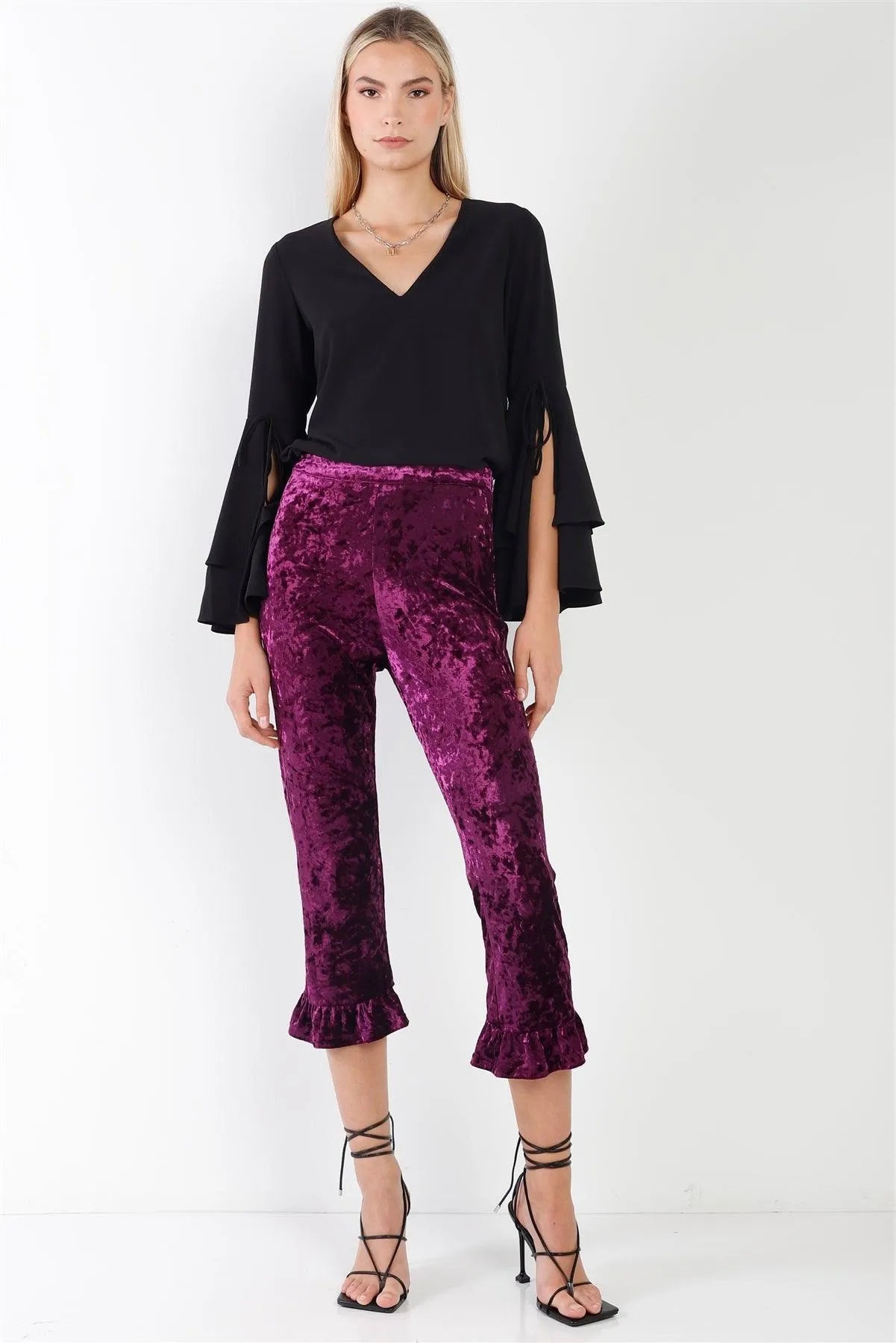 Jet Black V-Neck Long Bluebell Slit Draw String Tie Double Frill Sleeve Top