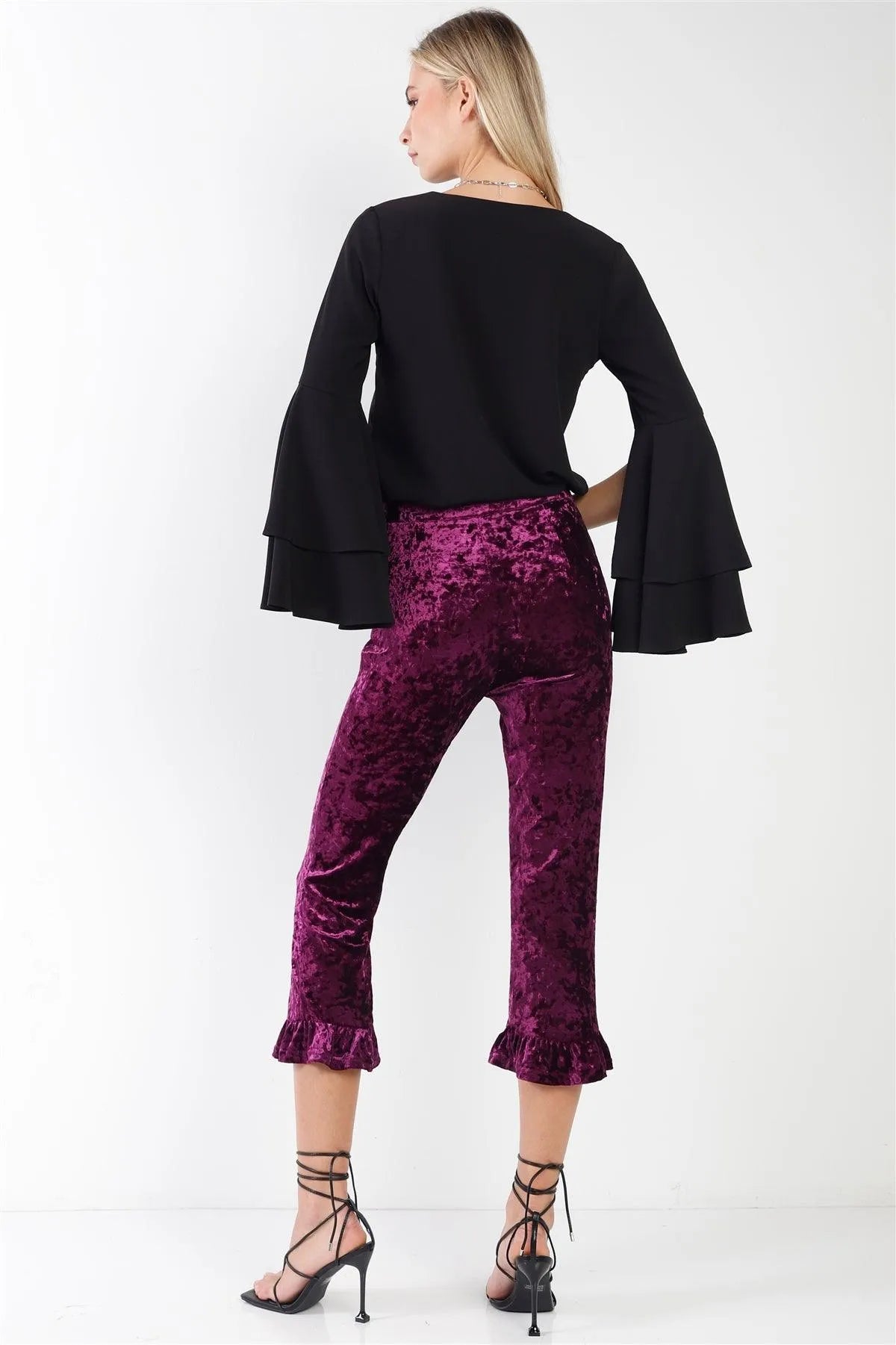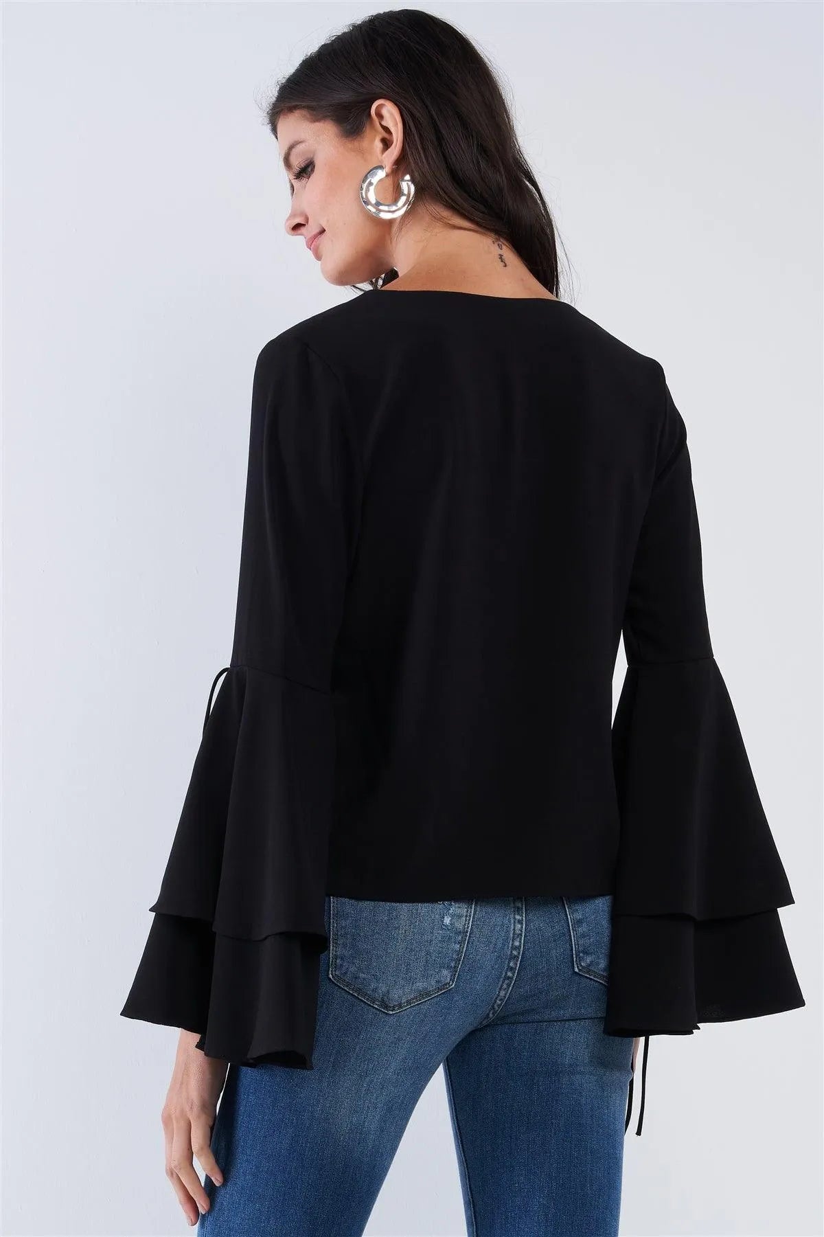 Jet Black V-Neck Long Bluebell Slit Draw String Tie Double Frill Sleeve Top /3-3