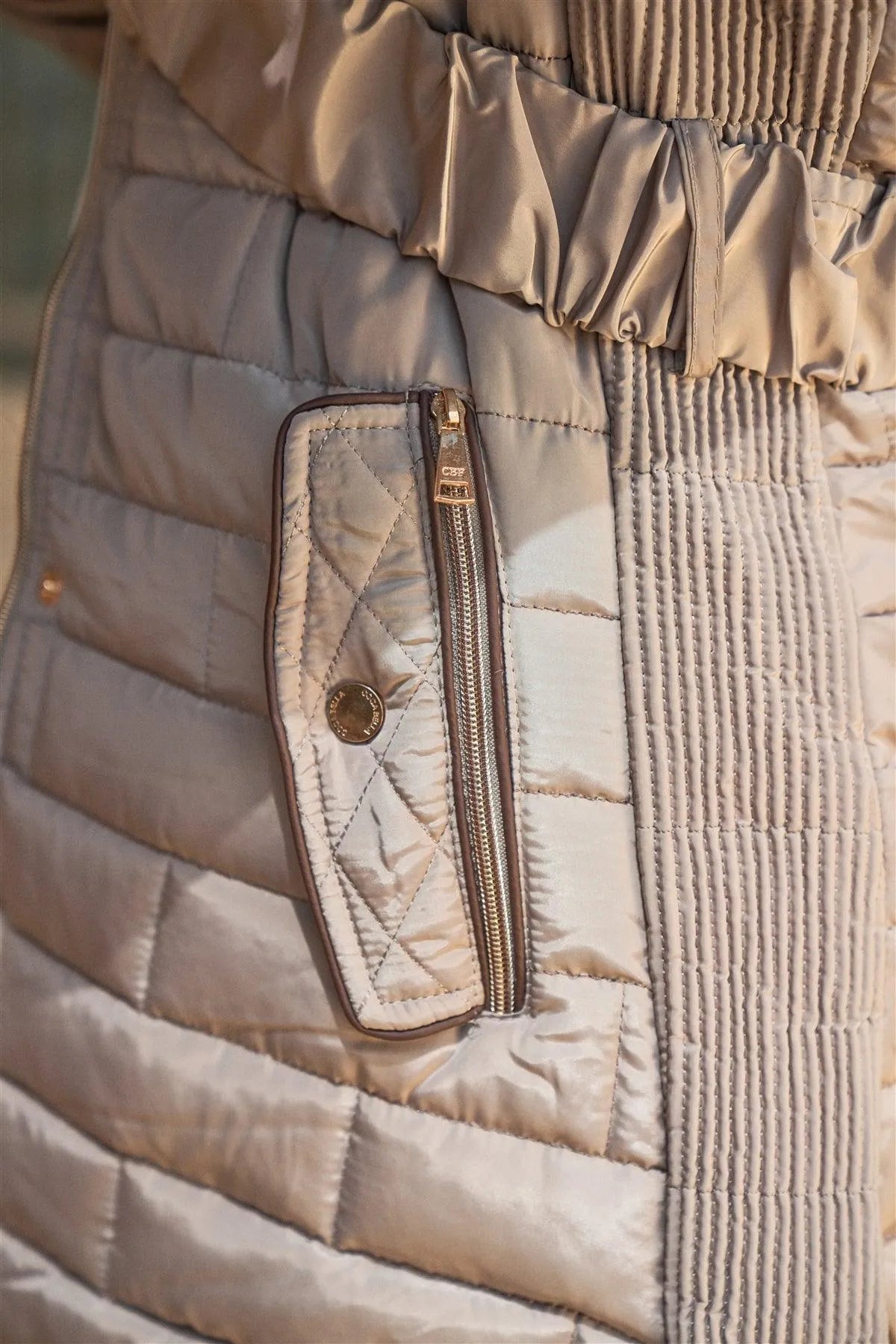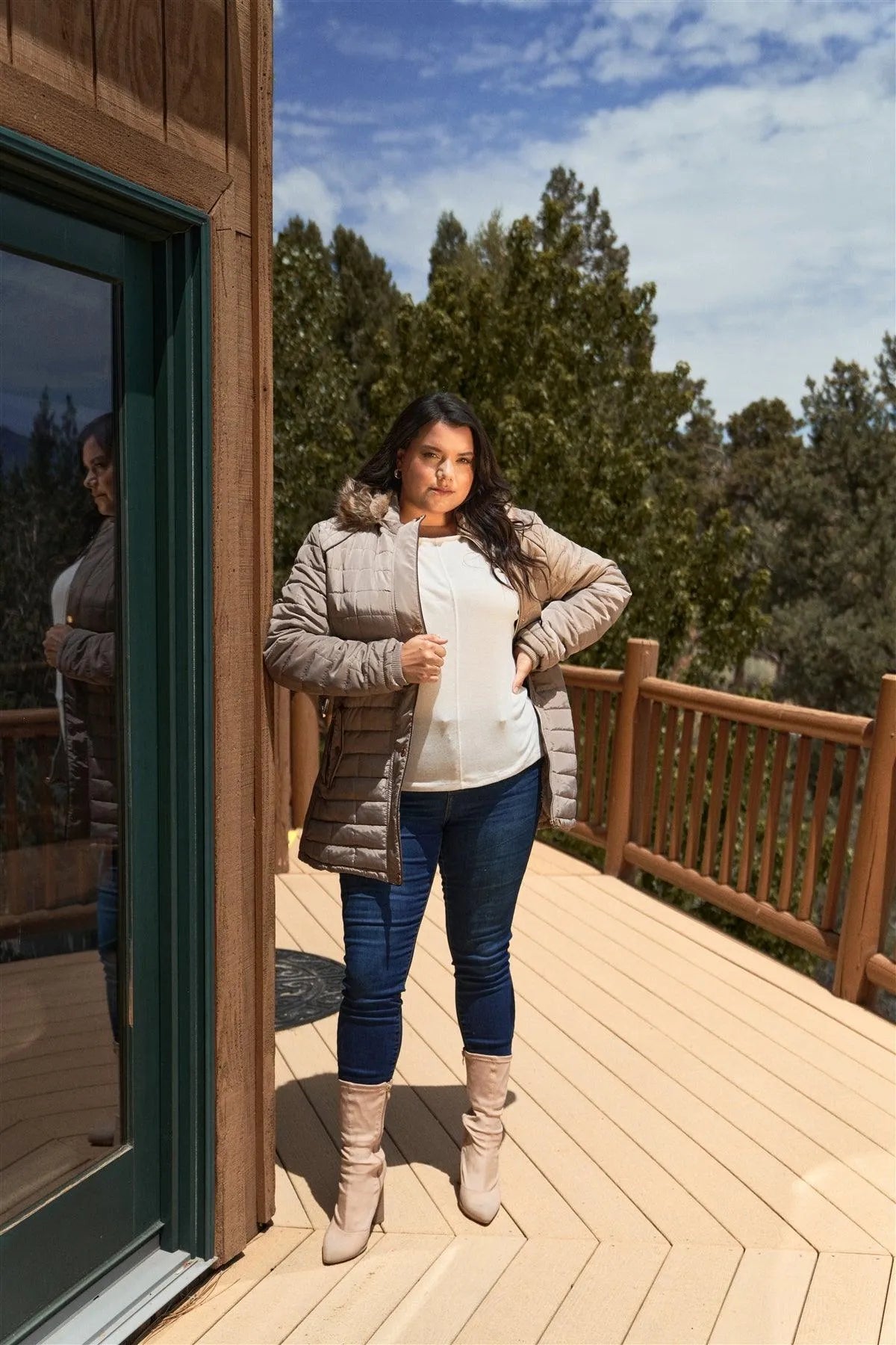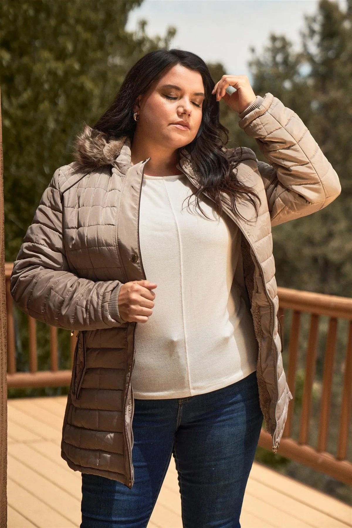 Junior Plus Beige Grey Diamond Back Quilt Straight Brick Quilt Faux Fur Hood Belted Padded Long Puffer Jacket