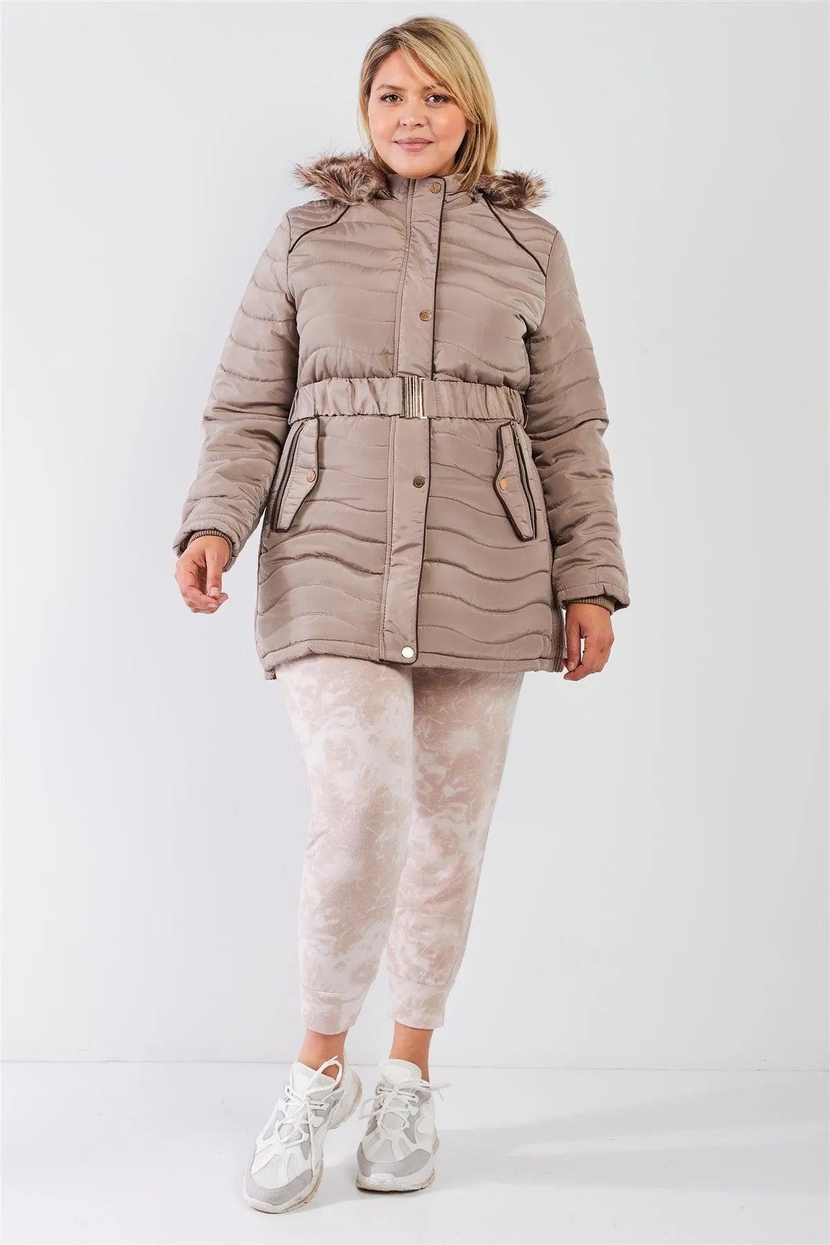 Junior Plus Beige-Tan Wavy Quilt Padded Faux Fur Detachable Hood Belted Long Puffer Jacket /1-1-1-1