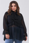 Junior Plus Black Balloon Sleeve Flare Cuff V-Neck With Self-Tie Necktie Detail Frill Detail Blouse Top /2-2-2