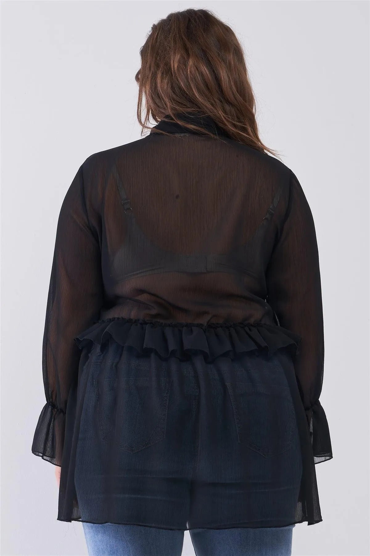 Junior Plus Black Balloon Sleeve Flare Cuff V-Neck With Self-Tie Necktie Detail Frill Detail Blouse Top /1-2-3