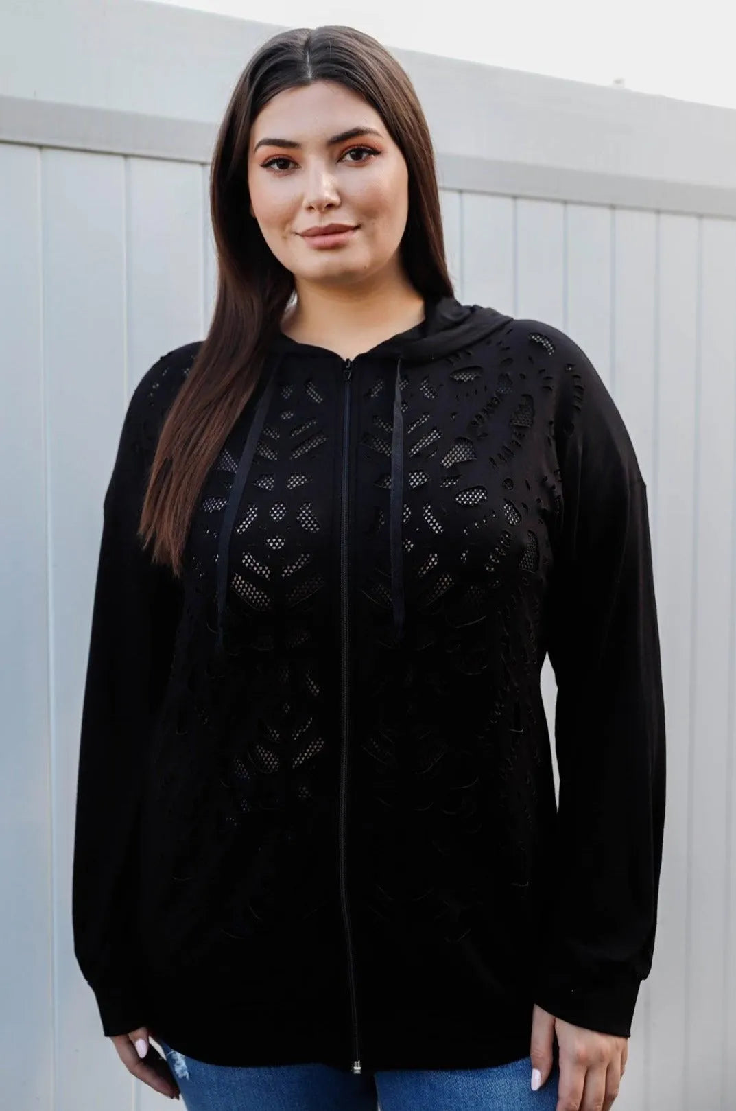 🖤 Expertly designed for curvy women, our Plus Size Cut-Out Fishnet Zip-Up Hoodie Sweatshirt combines functional features with trendy style. This black hoodie features cut-out print details with fishnet lining, adjustable drawstrings on the hood, and a zip-up closure for convenience. Its long cuffed sleeves and hem give a snug fit while its semi-sheer, stretchy fabric offers all-day comfort. Perfect for everyday wear or street style, this versatile sweatshirt is a must-have addition to your wardrobe.