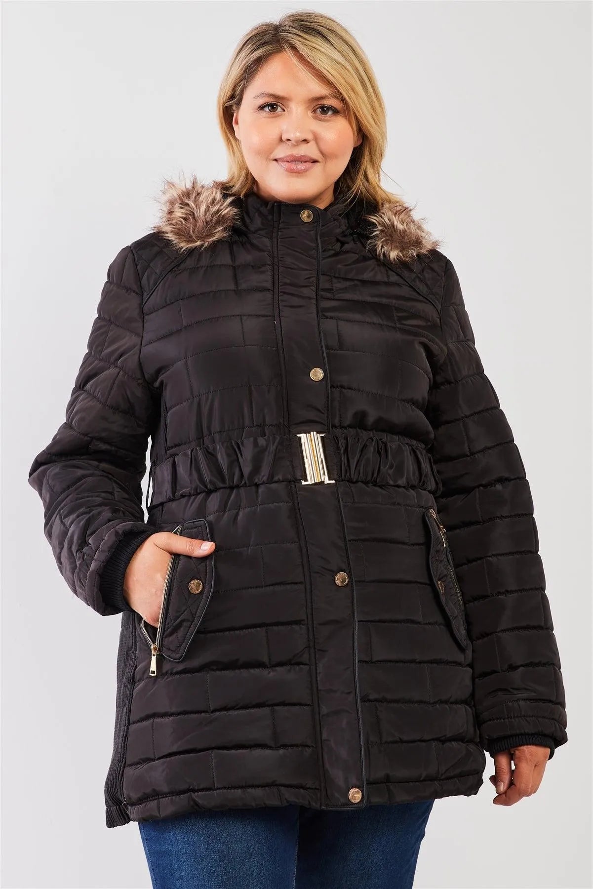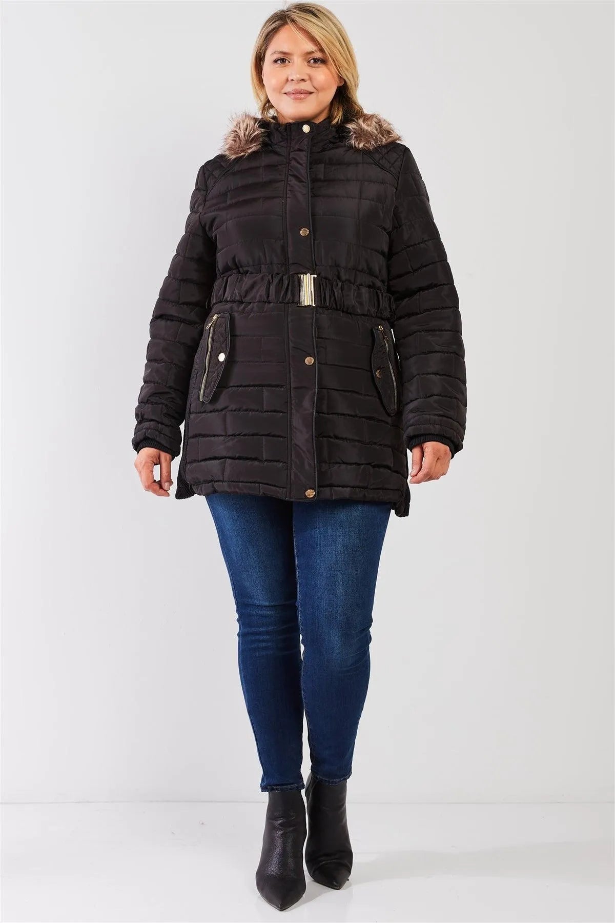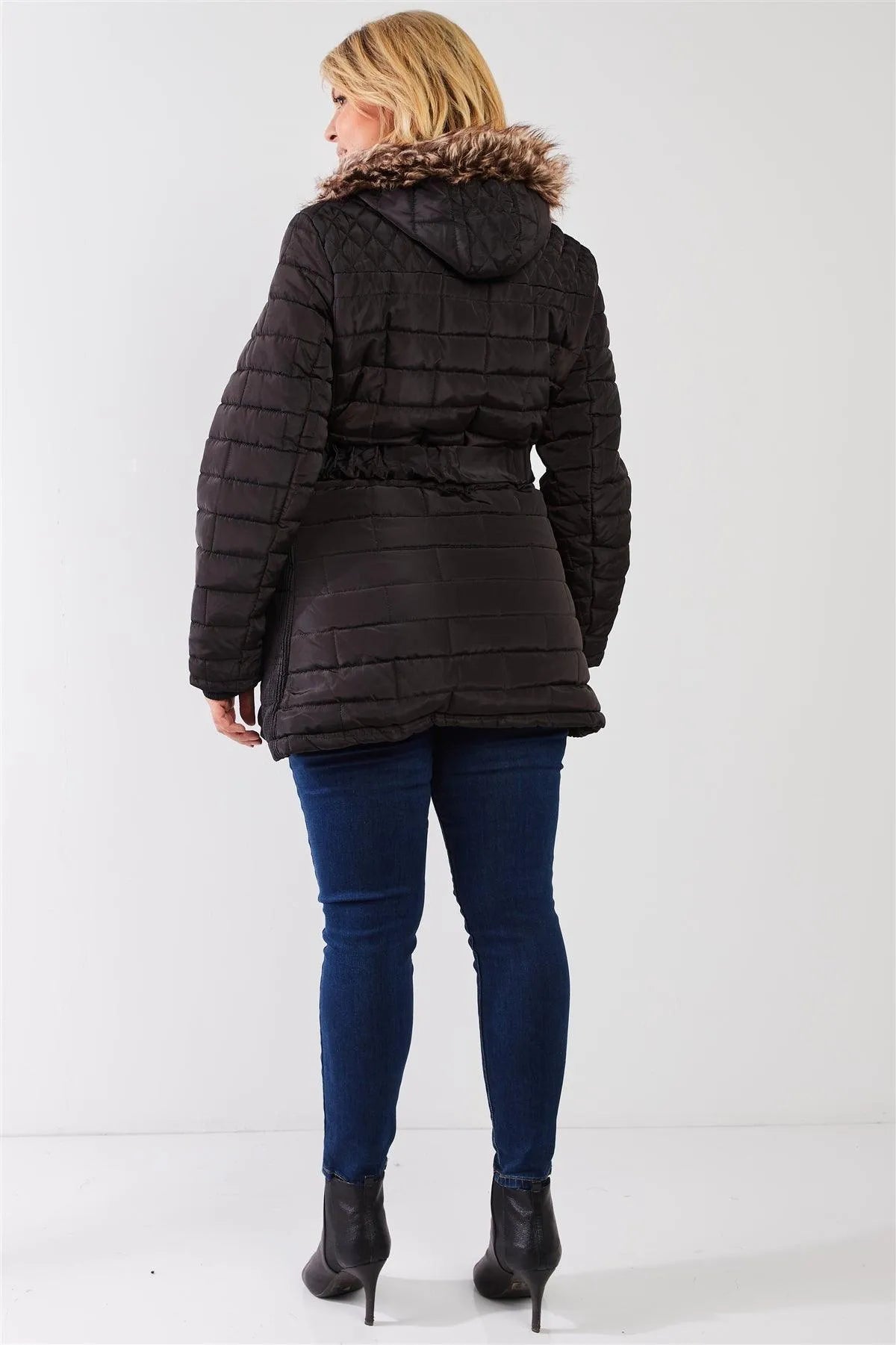 Junior Plus Black Diamond Quilt Faux Fur Hood Belted Padded Long Puffer Jacket /2-1-1
