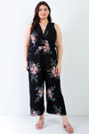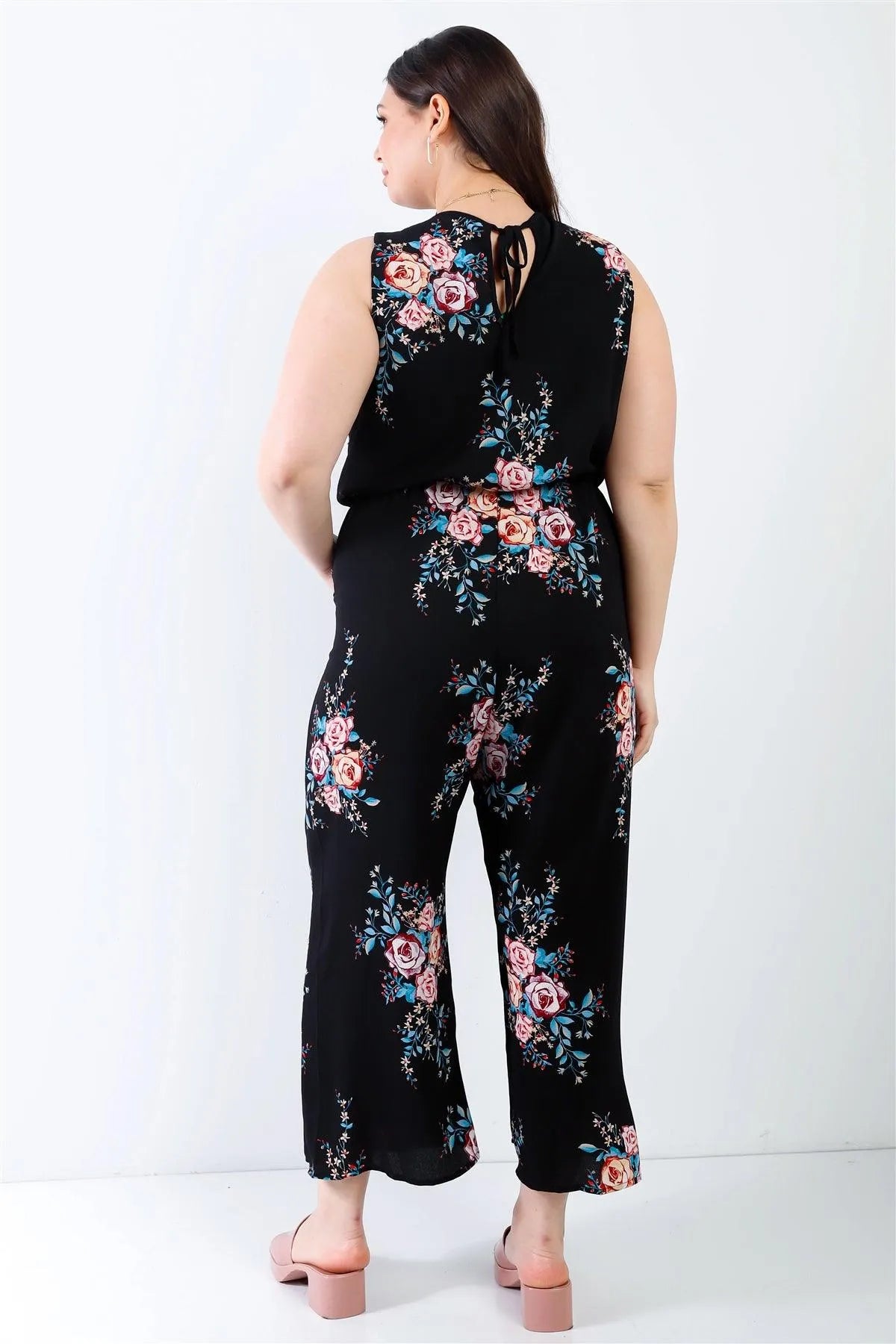 Junior Plus Black Flower Print Wrap V-Neck Back Self-Tie Detail Sleeveless Jumpsuit /3-3