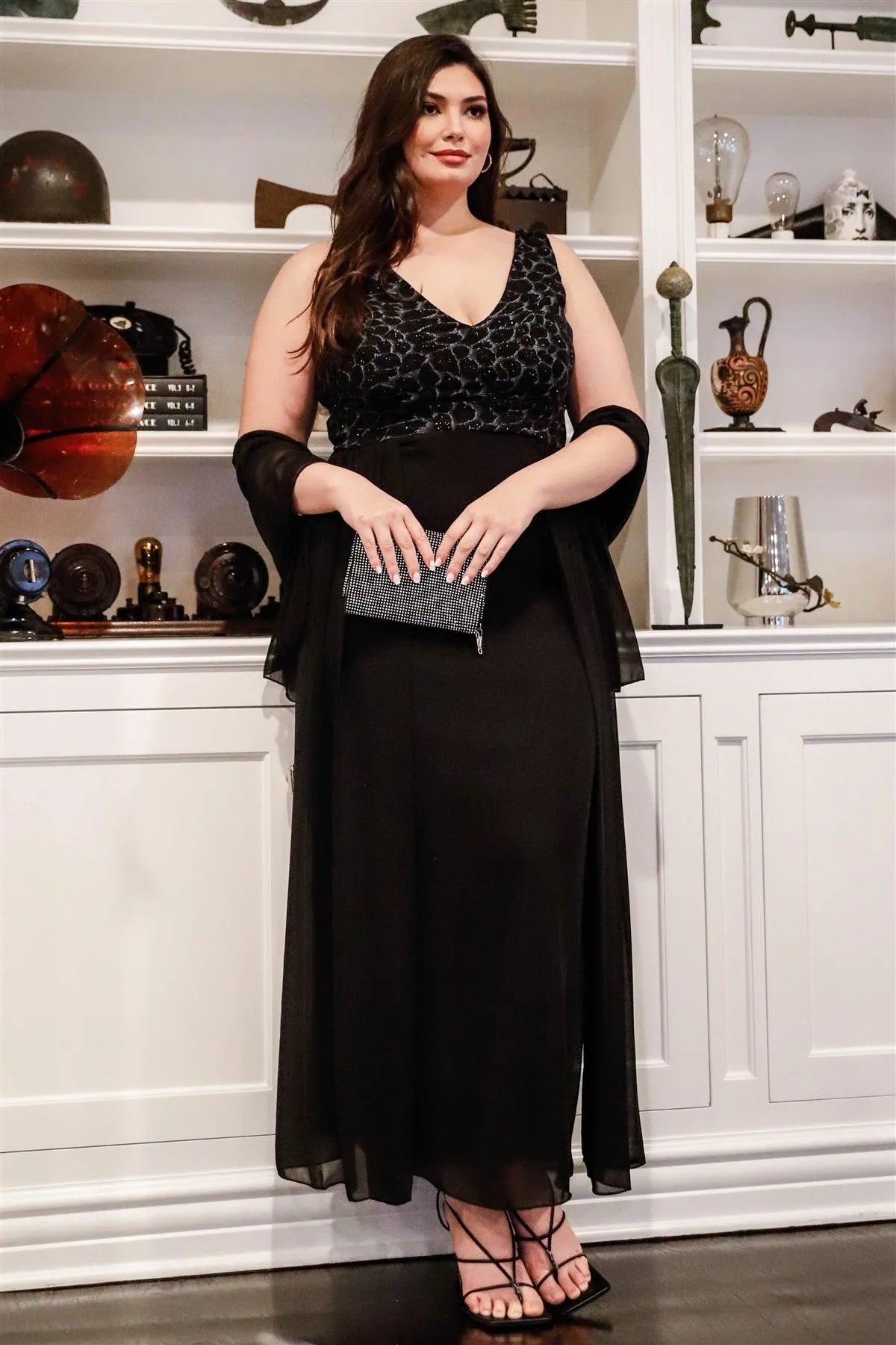 Junior Plus Black Lurex Animal Print Shawl Detail Maxi Dress /1-2-2