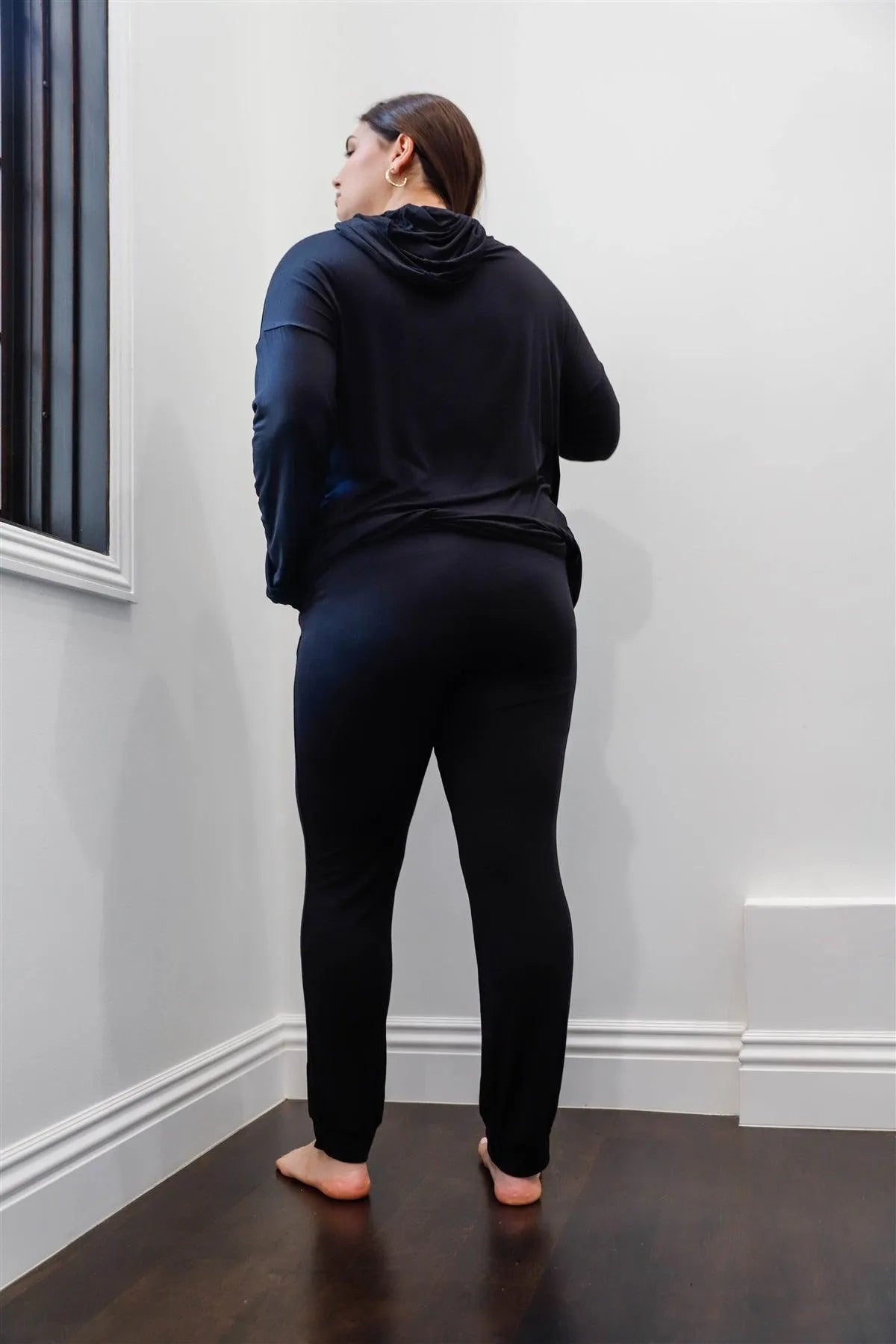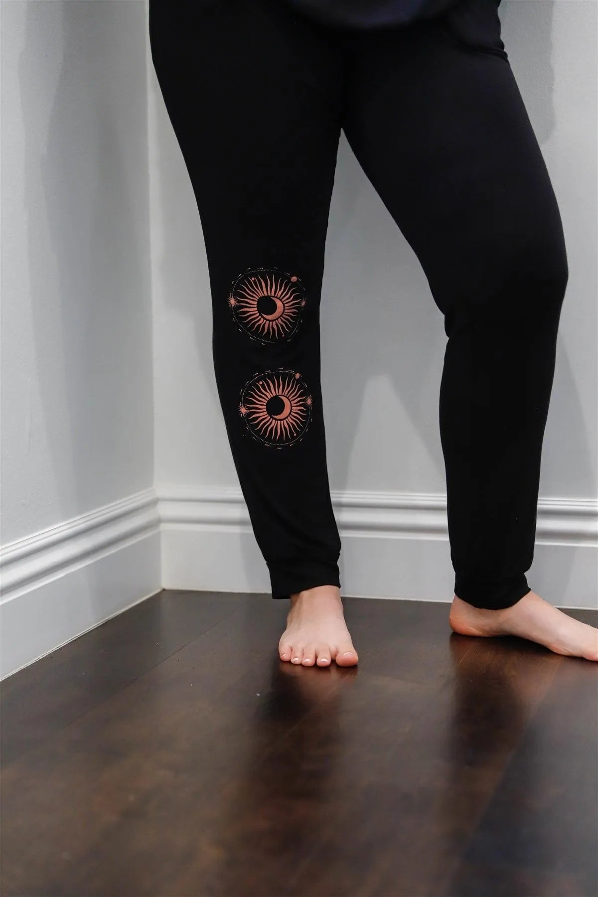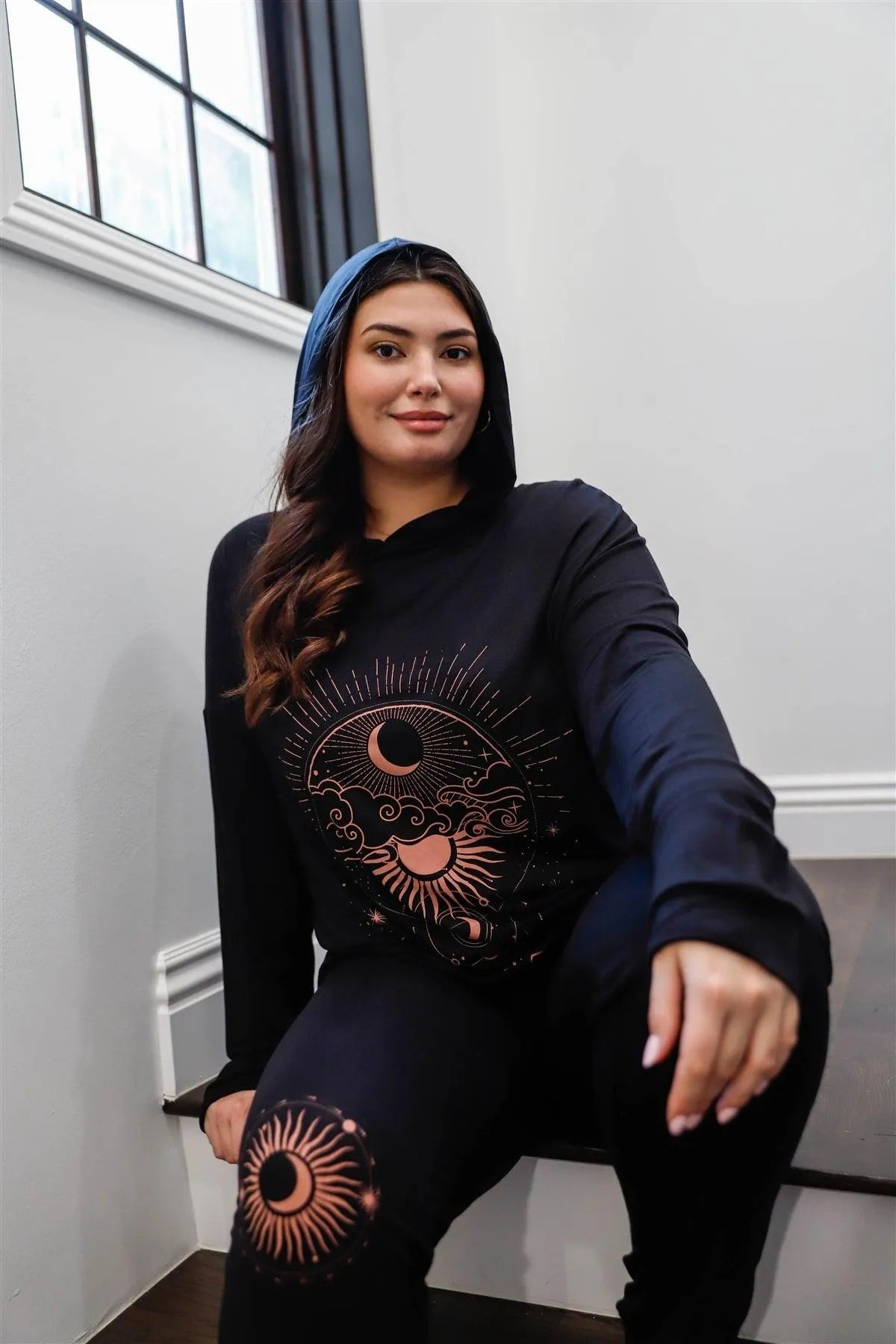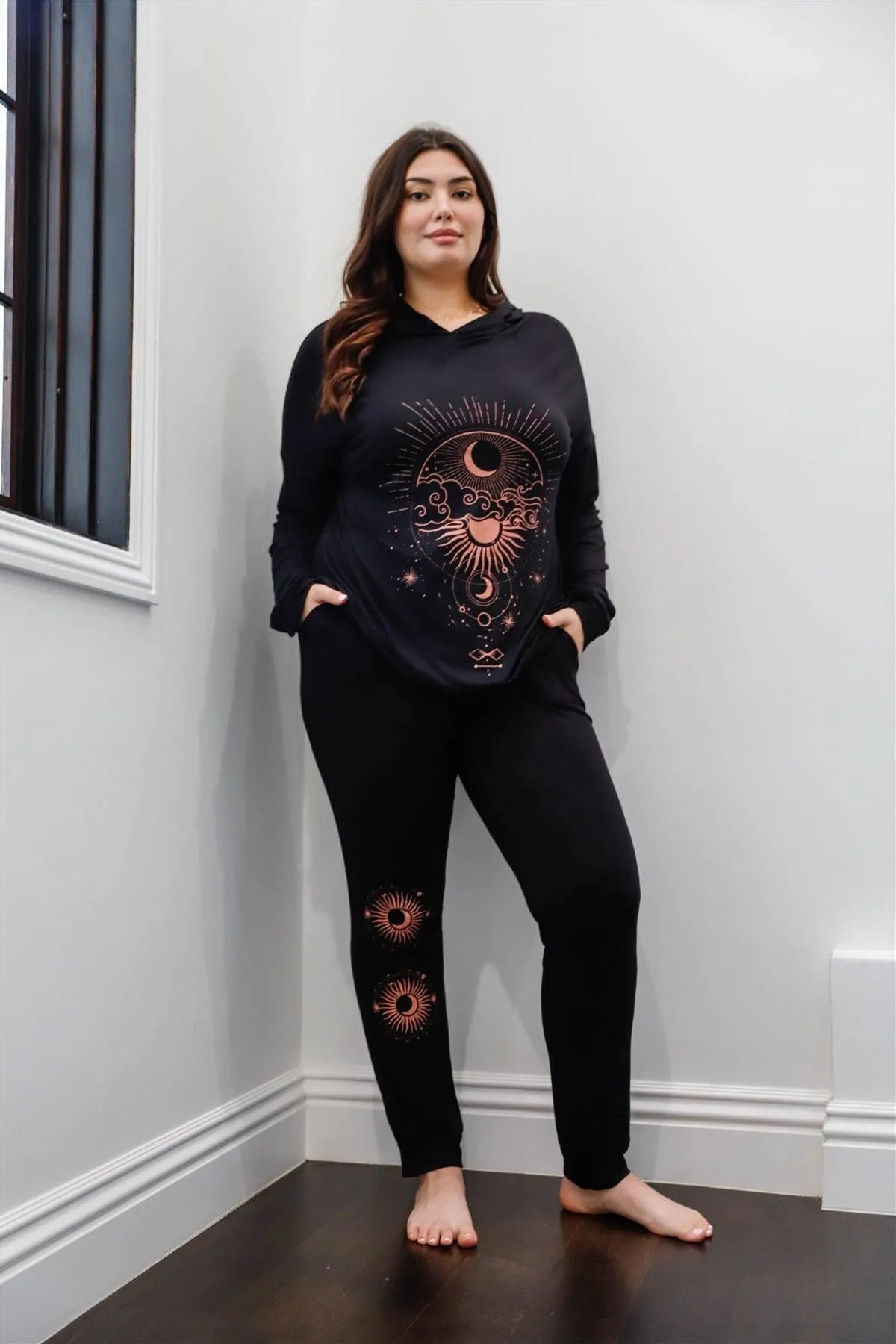 Junior Plus Black & Pink Moon Sun Astronomy Print Hooded Long Sleeve Top & Pants Set /1-1-1