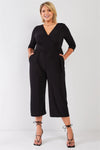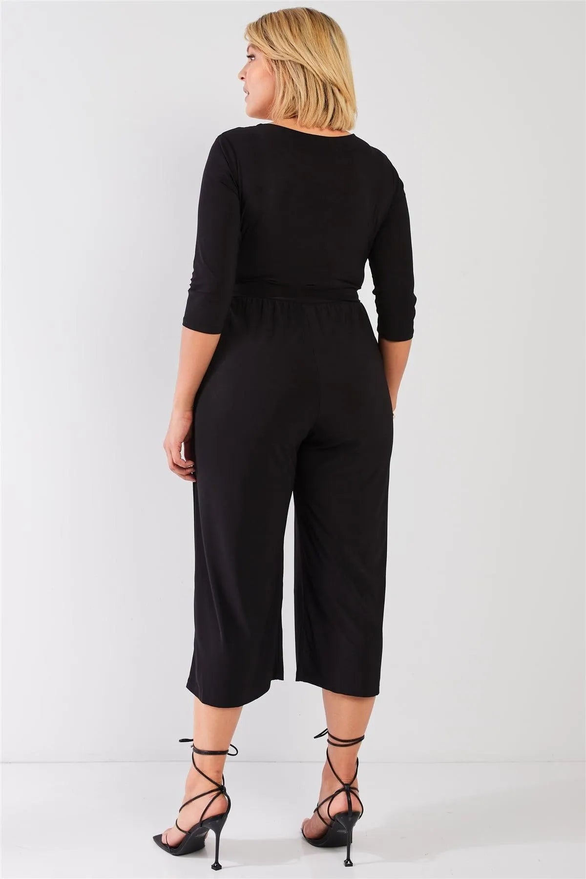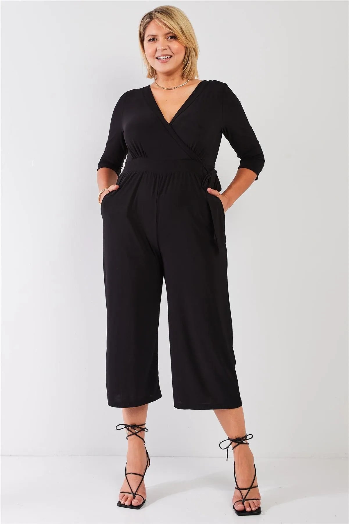 Junior Plus Black Plunging V-Neck Midi Sleeve Self-Tie Waist Detail Wide Leg Midi Jumpsuit /0X